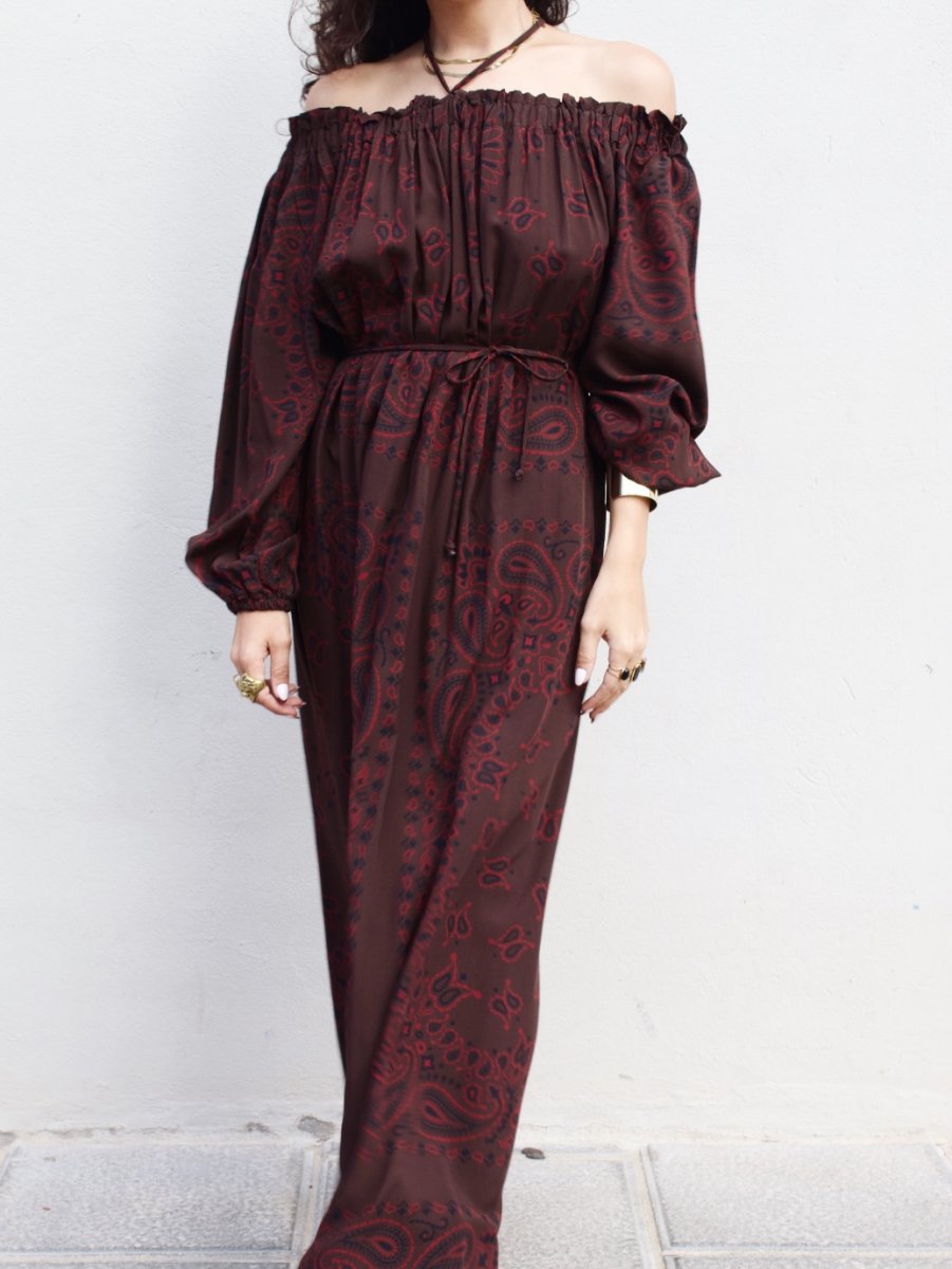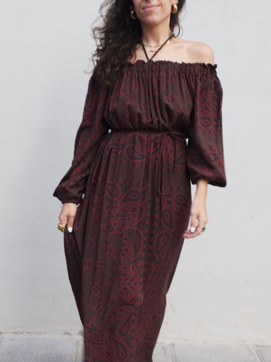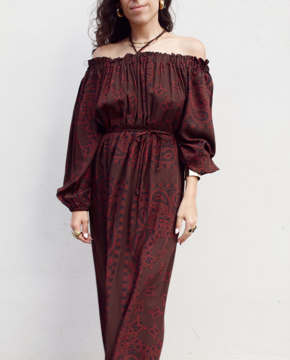 Abito lungo in viscosa con spalla scesa e maniche a palloncino.