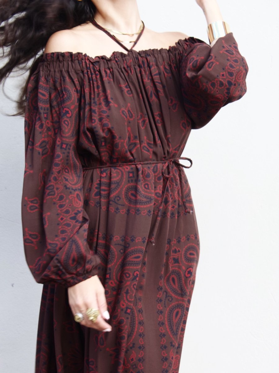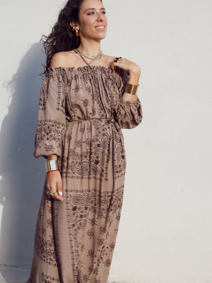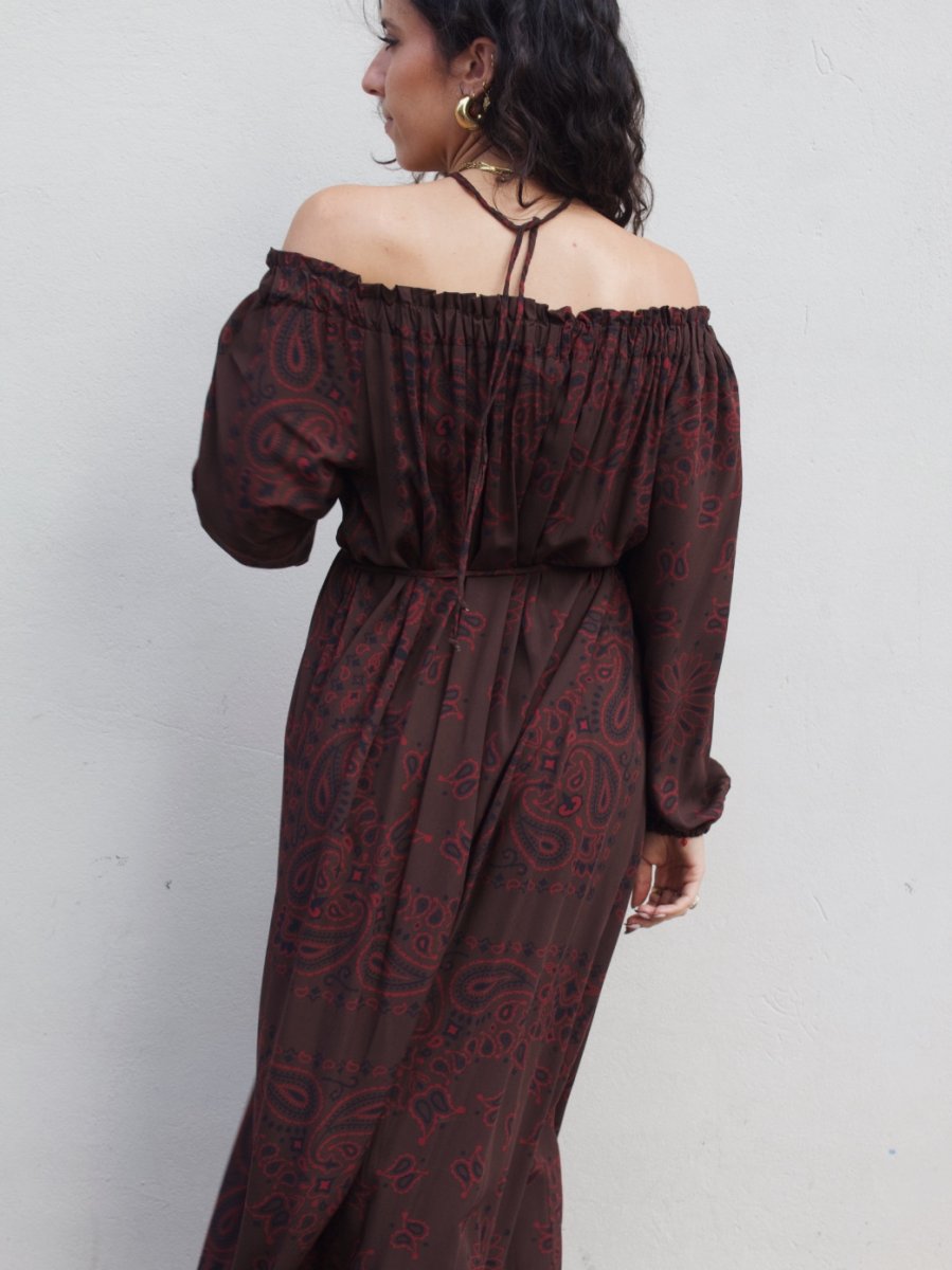 Abito lungo in viscosa con spalla scesa e maniche a palloncino.