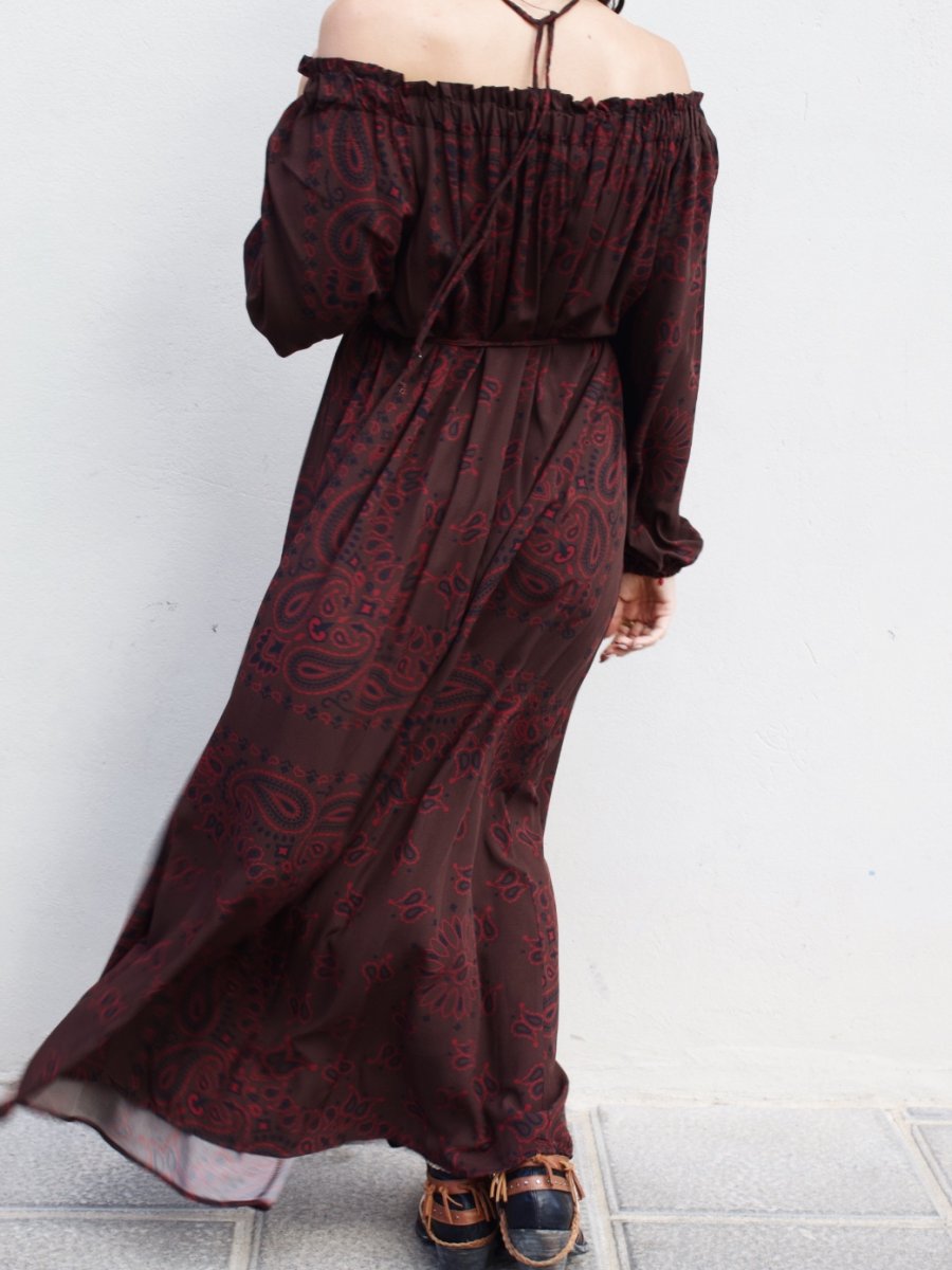 Abito lungo in viscosa con spalla scesa e maniche a palloncino. È taglia unica e veste fino ad una 48/50.