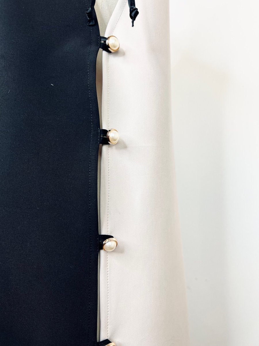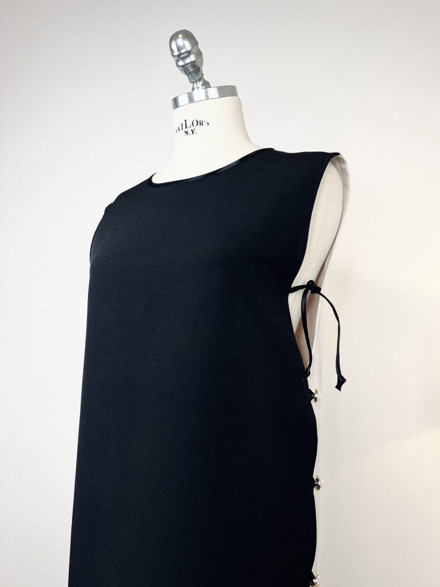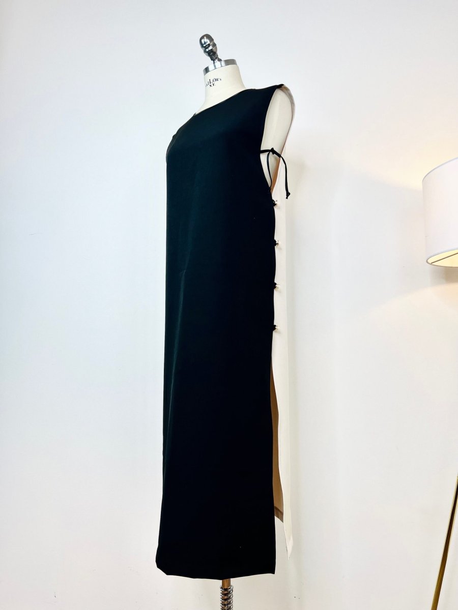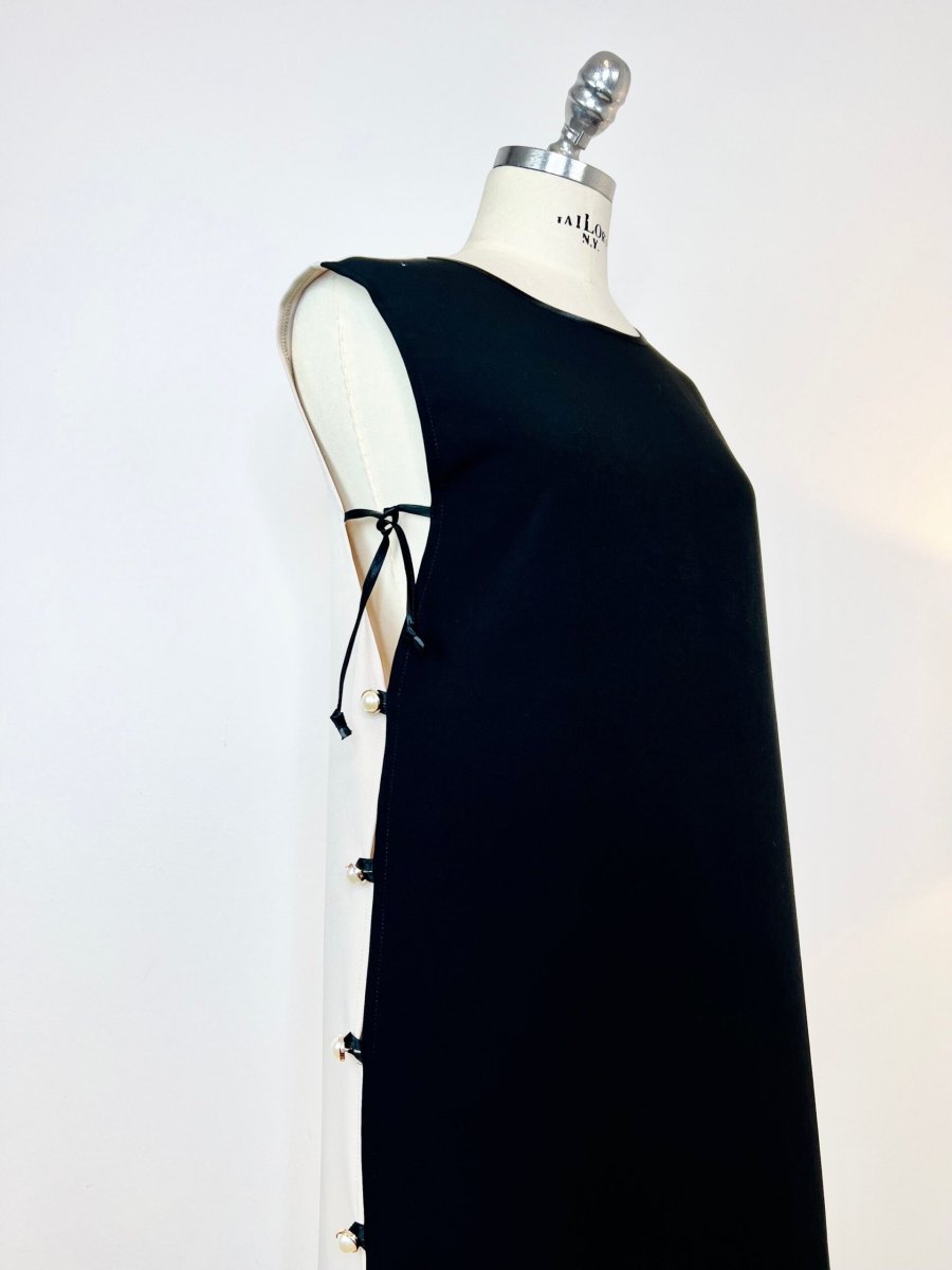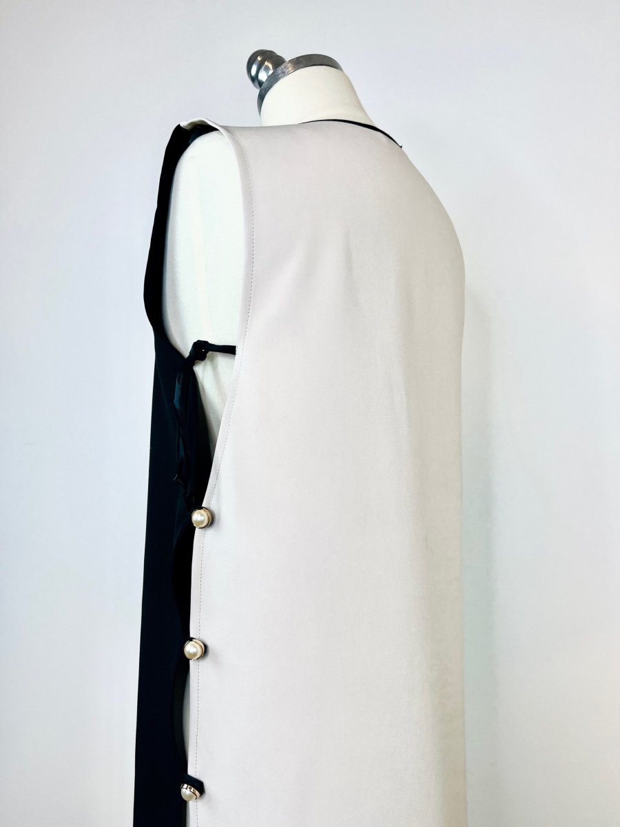 Abito lungo smanicato in cady di viscosa b-colore. La sua particolarità sono i due profondi spacchi laterali chiusi con asole e bottoni gioiello . Potrete scegliere di indossarlo sovrapposto sia a pantaloni che abiti sottoveste .È un nostro modello originale realizzato interamente a mano dal nostro laboratorio. È possibile realizzarlo fino ad un massimo di 125 cm di giro fianco e giro seno.