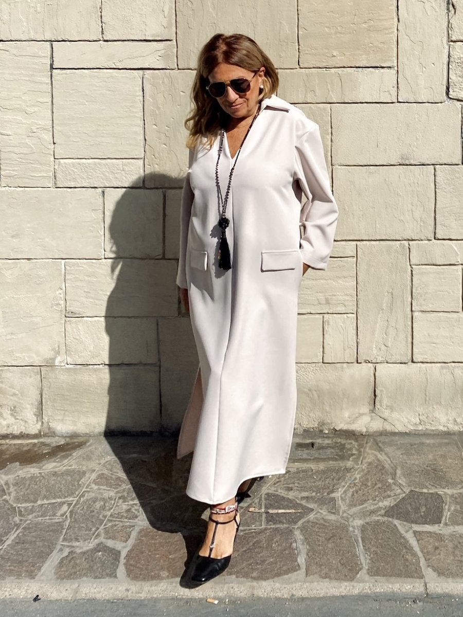 Abito lungo con manica in cady di viscosa e scollo a V con colletto revers . È arricchito da due pattine frontali e una cucitura centrale. La sua linea morbida e i suoi spacchi laterali lo rendono perfetto da abbinare anche a pantaloni e sottovesti. È un nostro modello originale realizzato interamente a mano dal […]