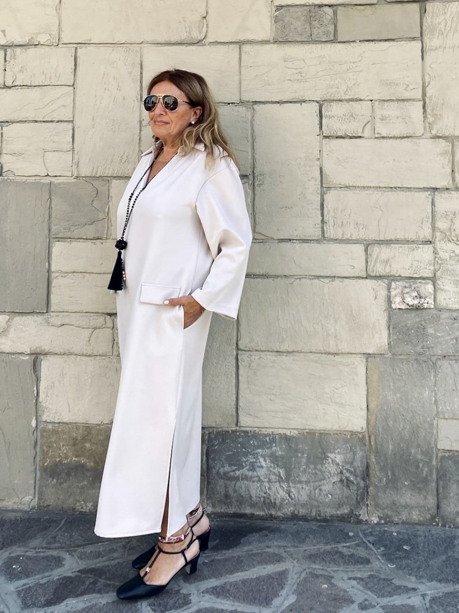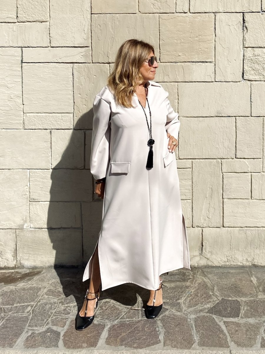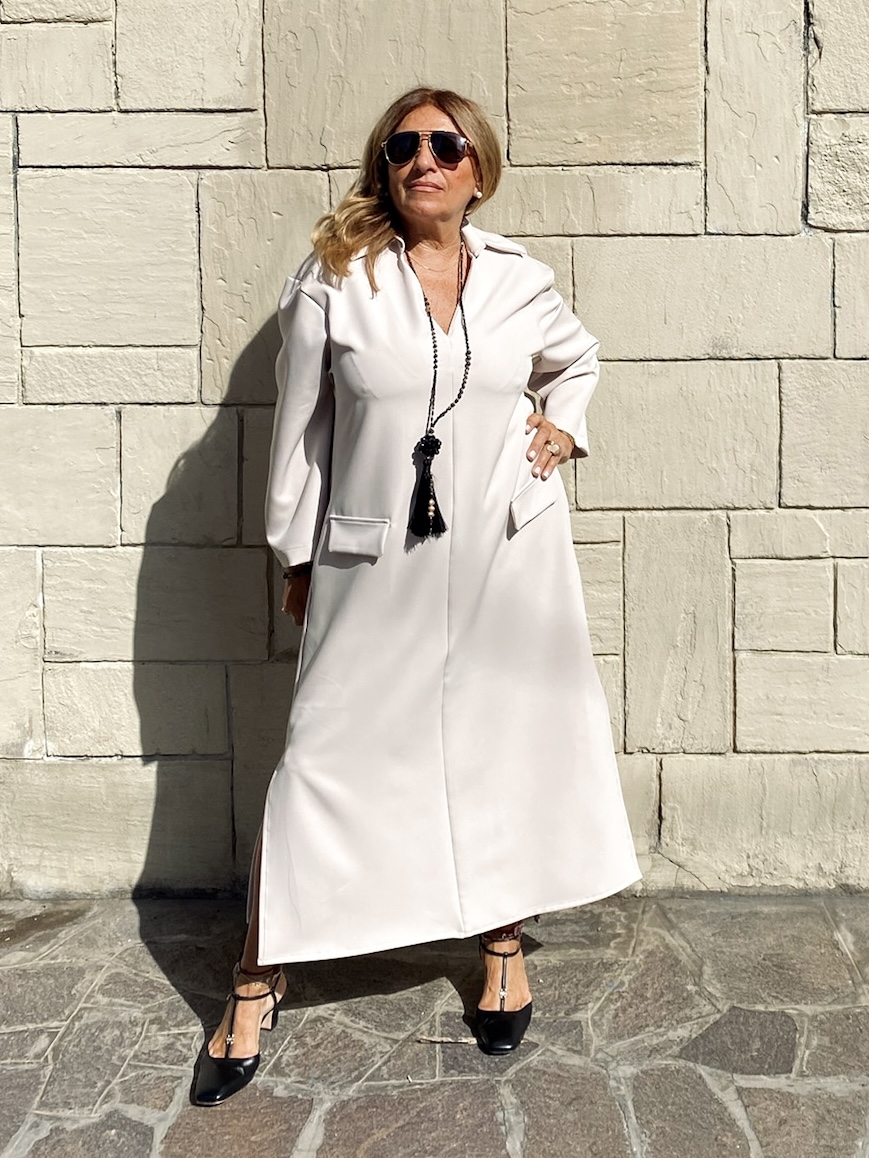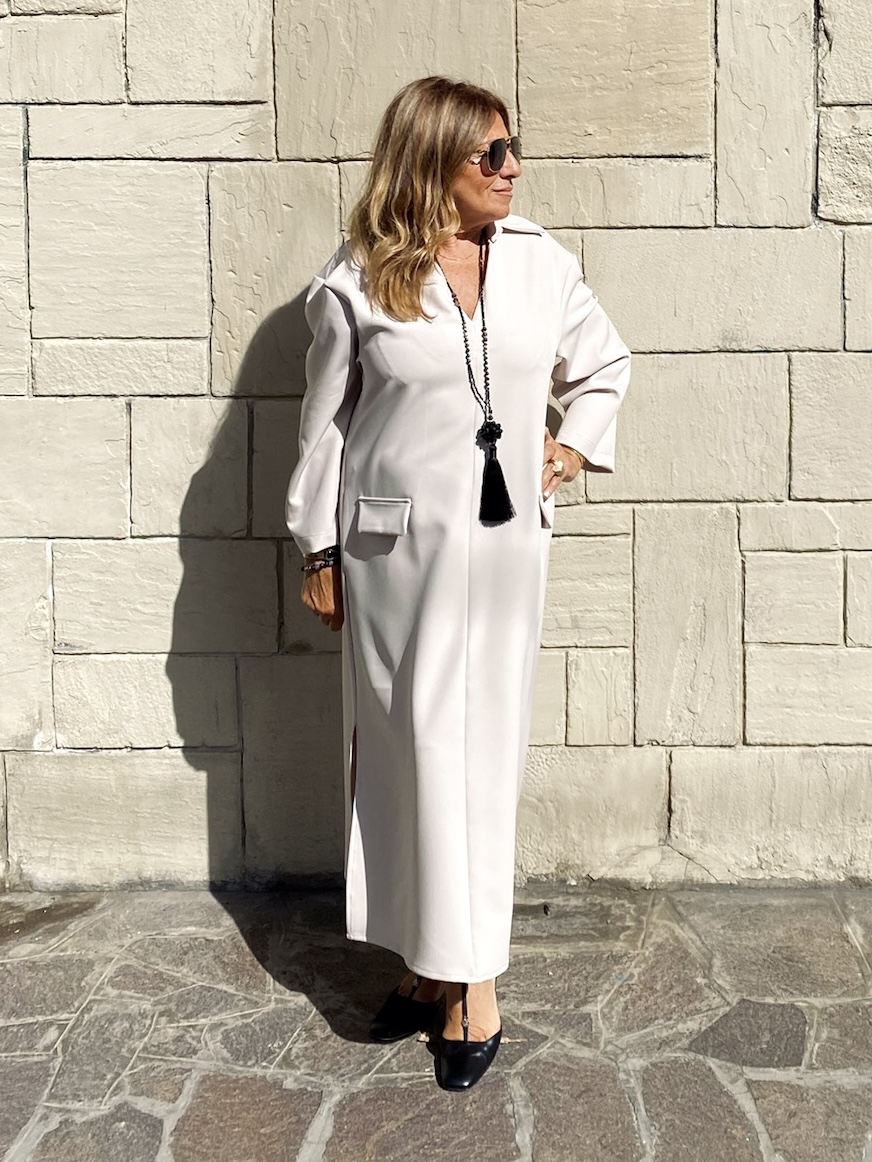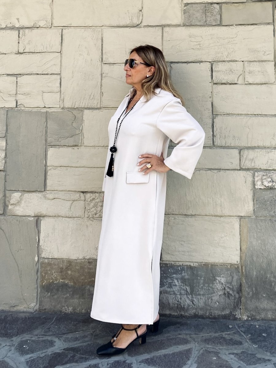 Abito lungo con manica in cady di viscosa e scollo a V con colletto revers . È arricchito da due pattine frontali e una cucitura centrale. La sua linea morbida e i suoi spacchi laterali lo rendono perfetto da abbinare anche a pantaloni e sottovesti. È un nostro modello originale realizzato interamente a mano dal nostro laboratorio. È possibile realizzarlo fino ad un massimo di 125 cm di giro fianco.