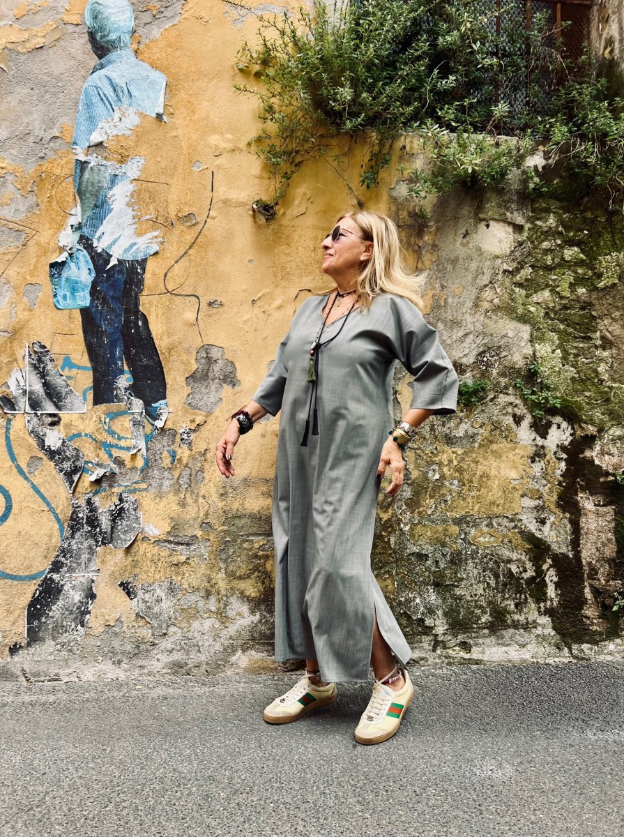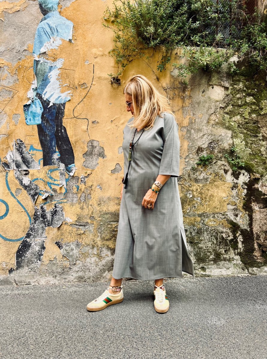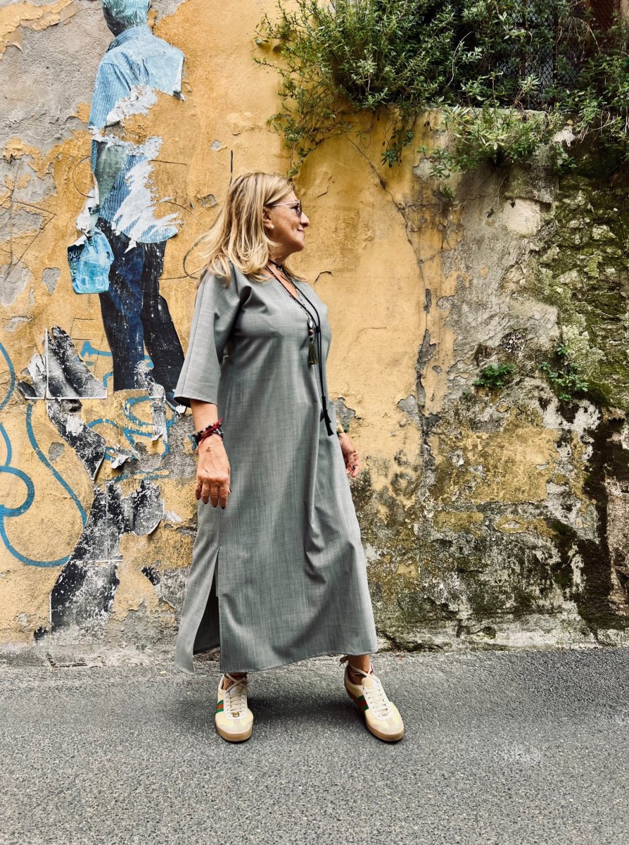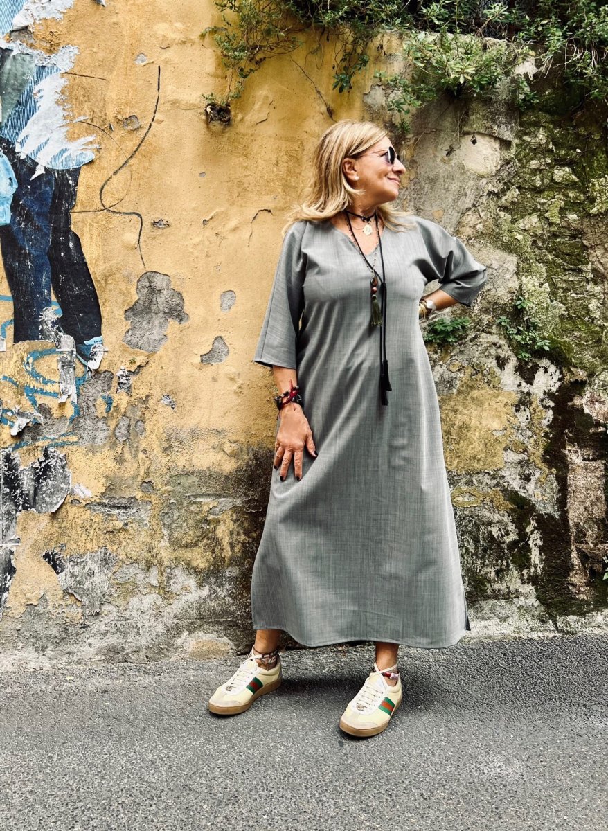 Abito lungo con manica in tessuto fresco di lana . La sua linea morbida e i suoi spacchi laterali lo rendono perfetto da abbinare anche a pantaloni e sottovesti. È un nostro modello originale realizzato interamente a mano dal nostro laboratorio. È possibile realizzarlo fino ad un massimo di 125 cm di giro fianco e giro seno.