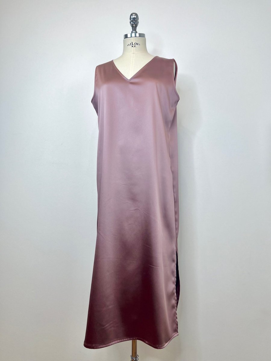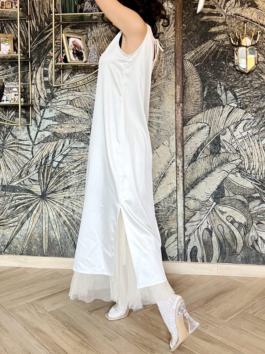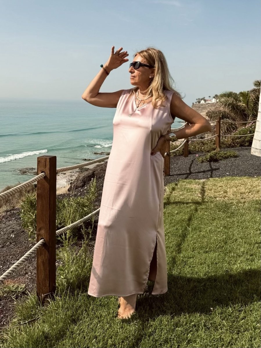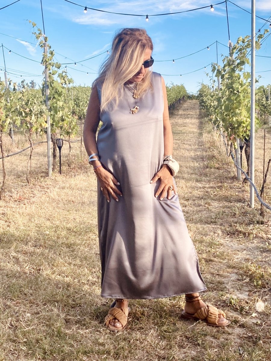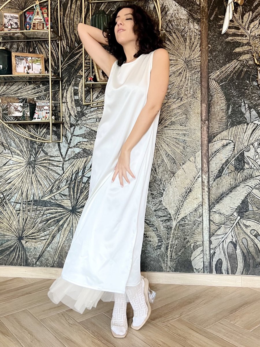 Abito lungo smanicato in raso di viscosa tinta unita . La sua linea morbida e i suoi spacchi laterali lo rendono perfetto da abbinare anche a pantaloni e sottovesti. È un nostro modello originale realizzato interamente a mano dal nostro laboratorio. È possibile realizzarlo fino ad un massimo di 125 cm di giro fianco e giro fianco.