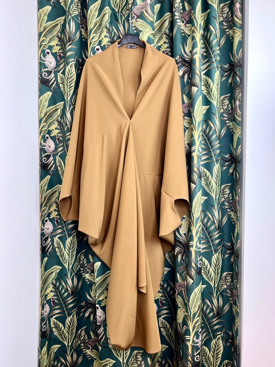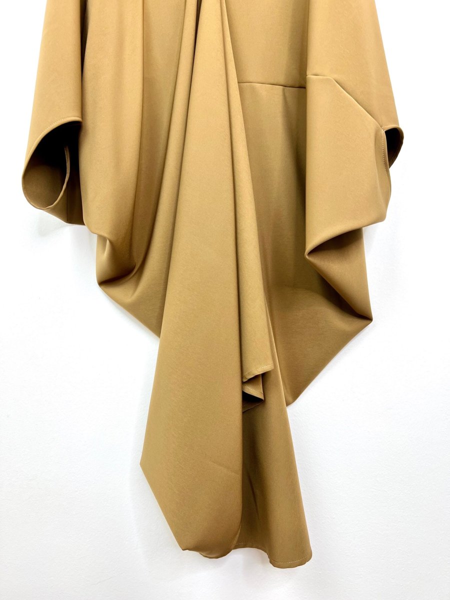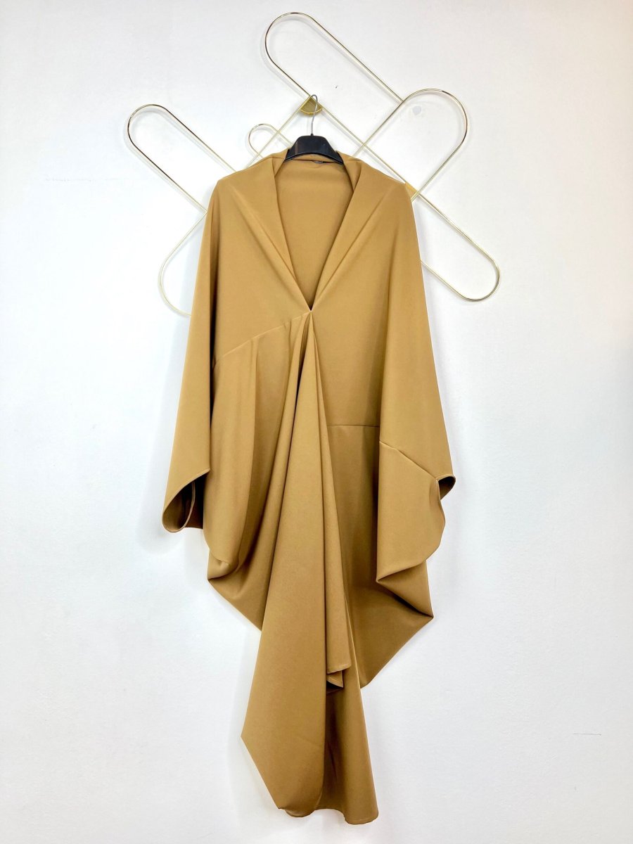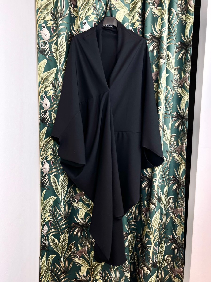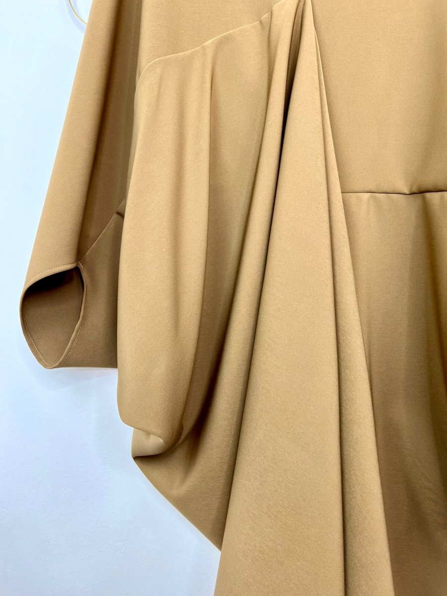 Abito ampio con taglio asimmetrico . Presenta maniche a pipistrello e uno scollo profondo . È prodotto interamente a mano dal nostro laboratorio sartoria . È taglia unica e veste da una 40 ad una 48.