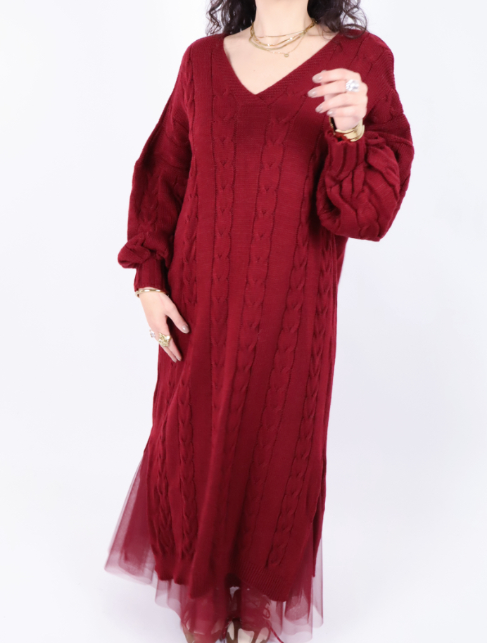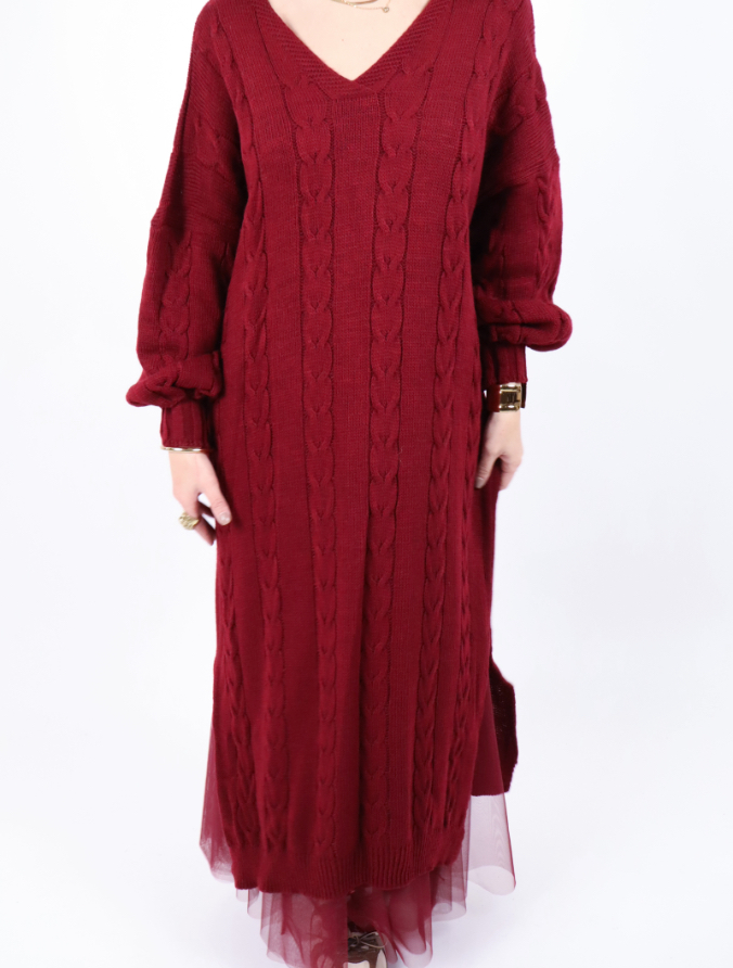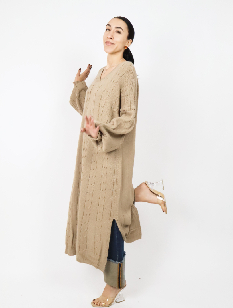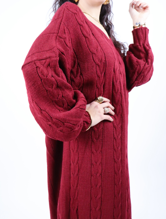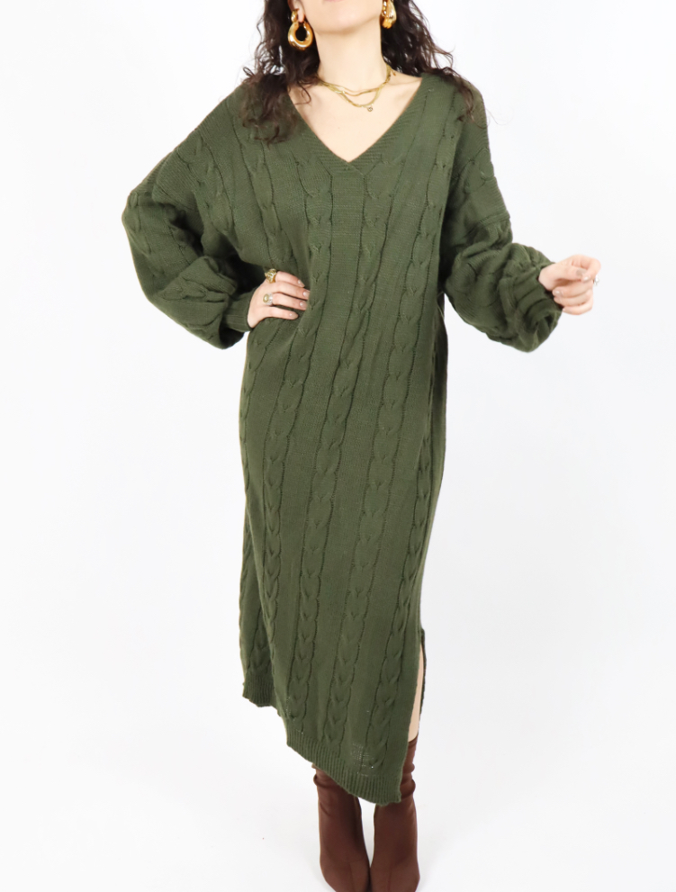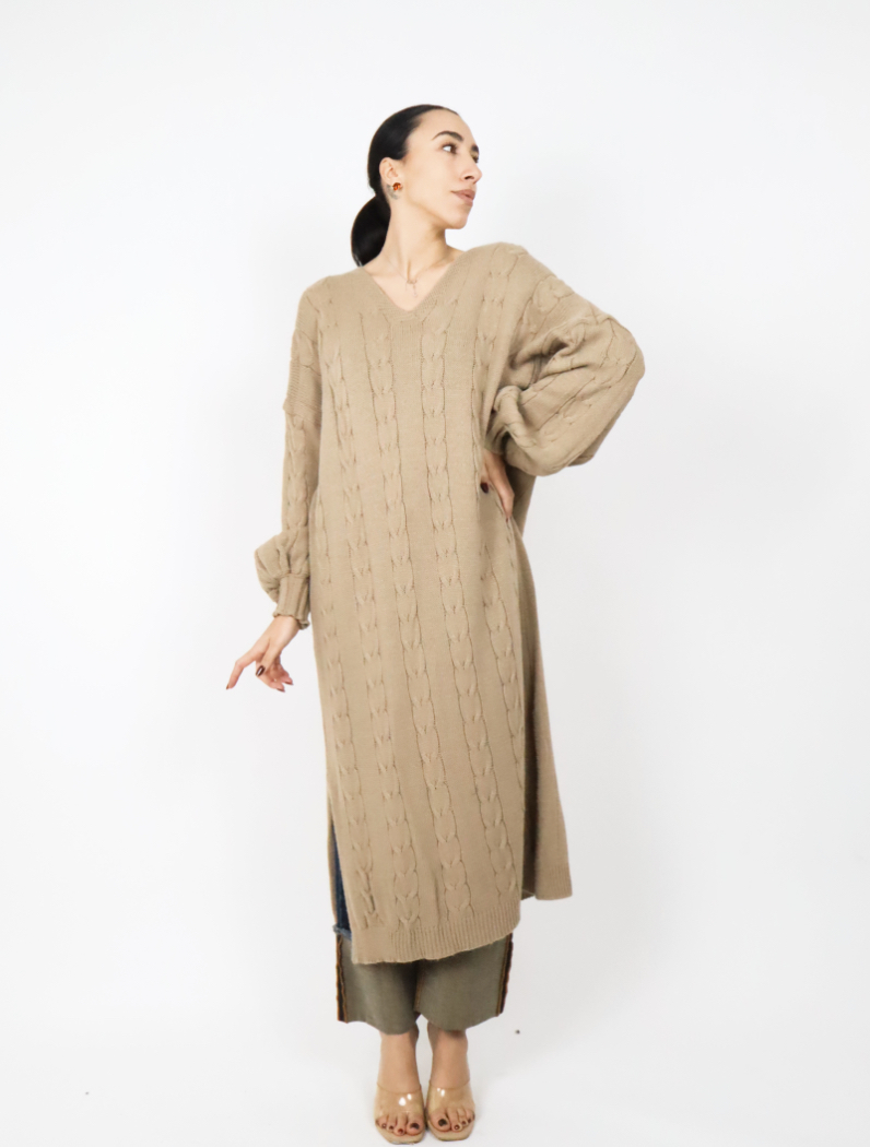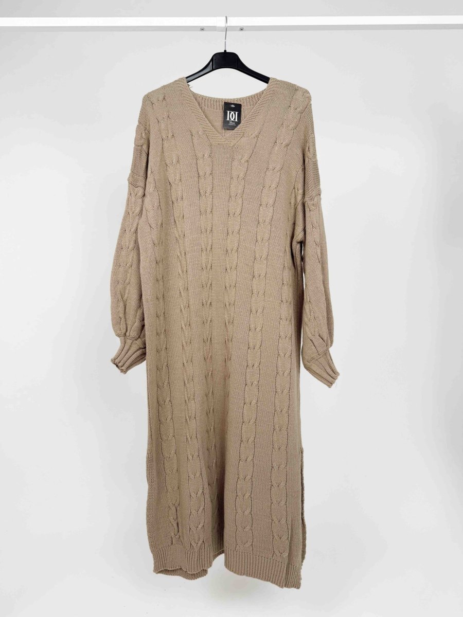 Abito lungo in maglia con motivo a treccia e spacchi laterali. È taglia unica e veste fino ad una 48/50.