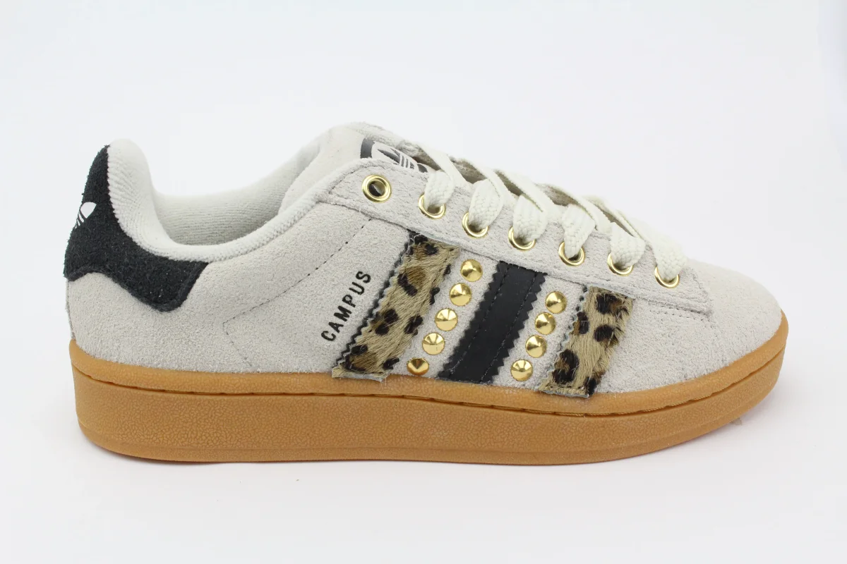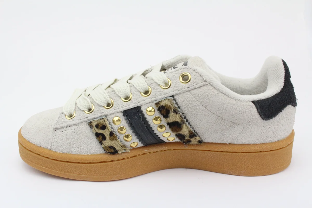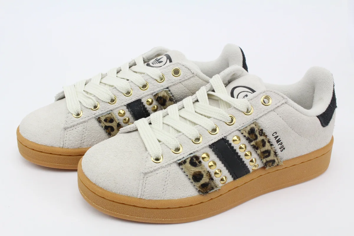 Scarpe originali Adidas Campus Orbit Grey personalizzate con applicazioni sulle pareti sia interna che esterna di macula, striscia nera centrale originale e aggiunte borchie Oro. Ogni imperfezione è frutto del lavoro svolto artigianalmente.