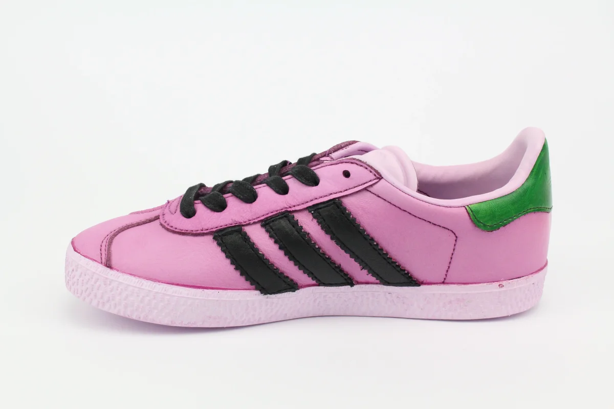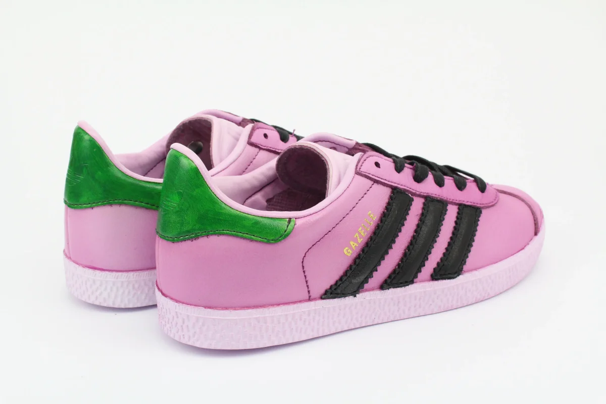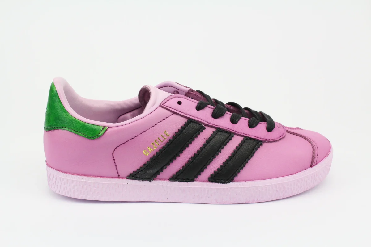 Scarpe originali Adidas Gazelle personalizzate con personalizzate con lavaggio colorato Rosa, applicazione di pelle nera sulle bande e tallone dipinto a mano in colore verde.