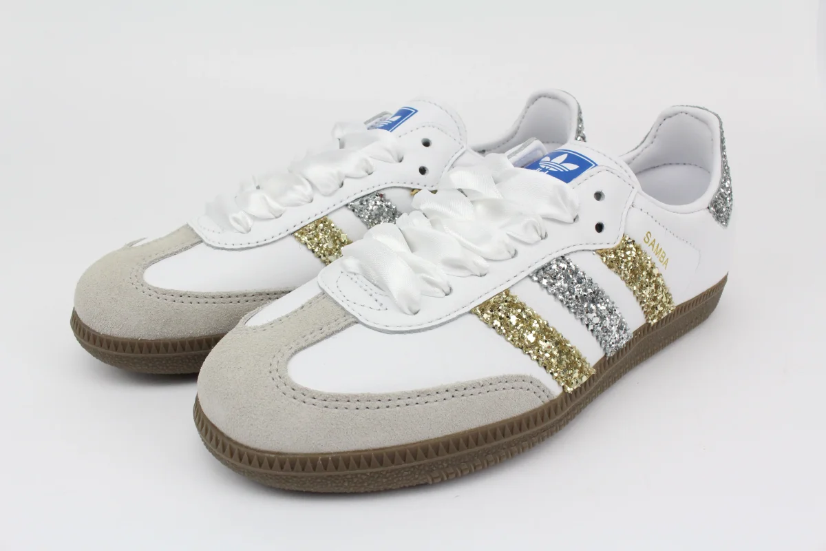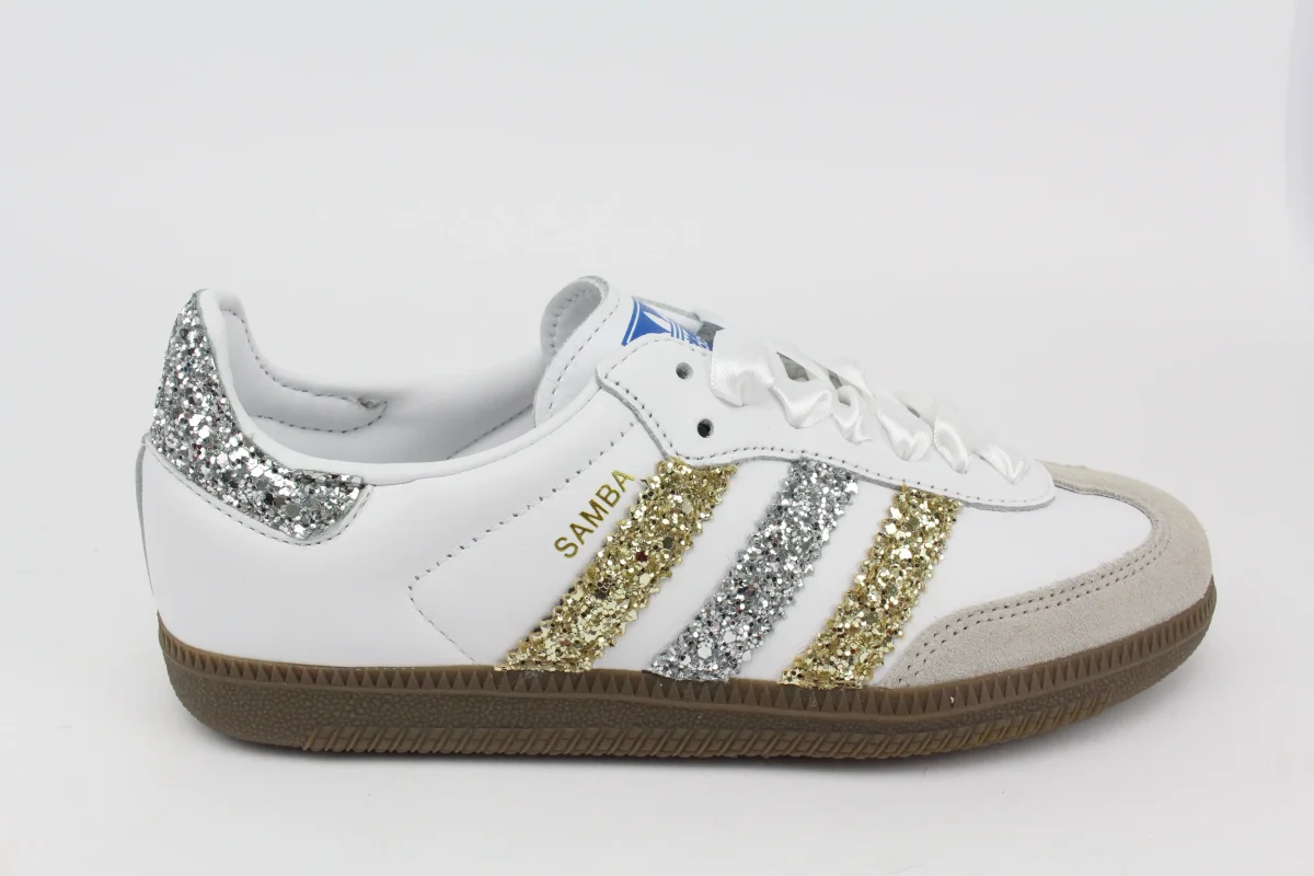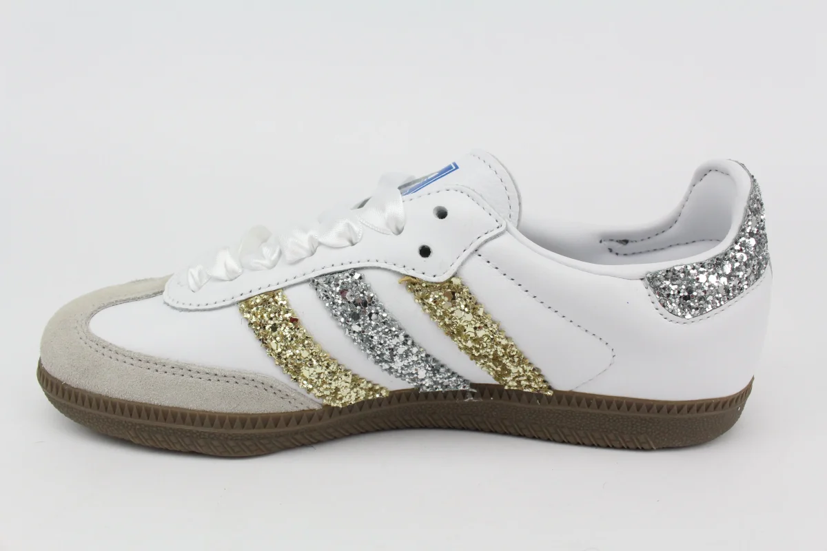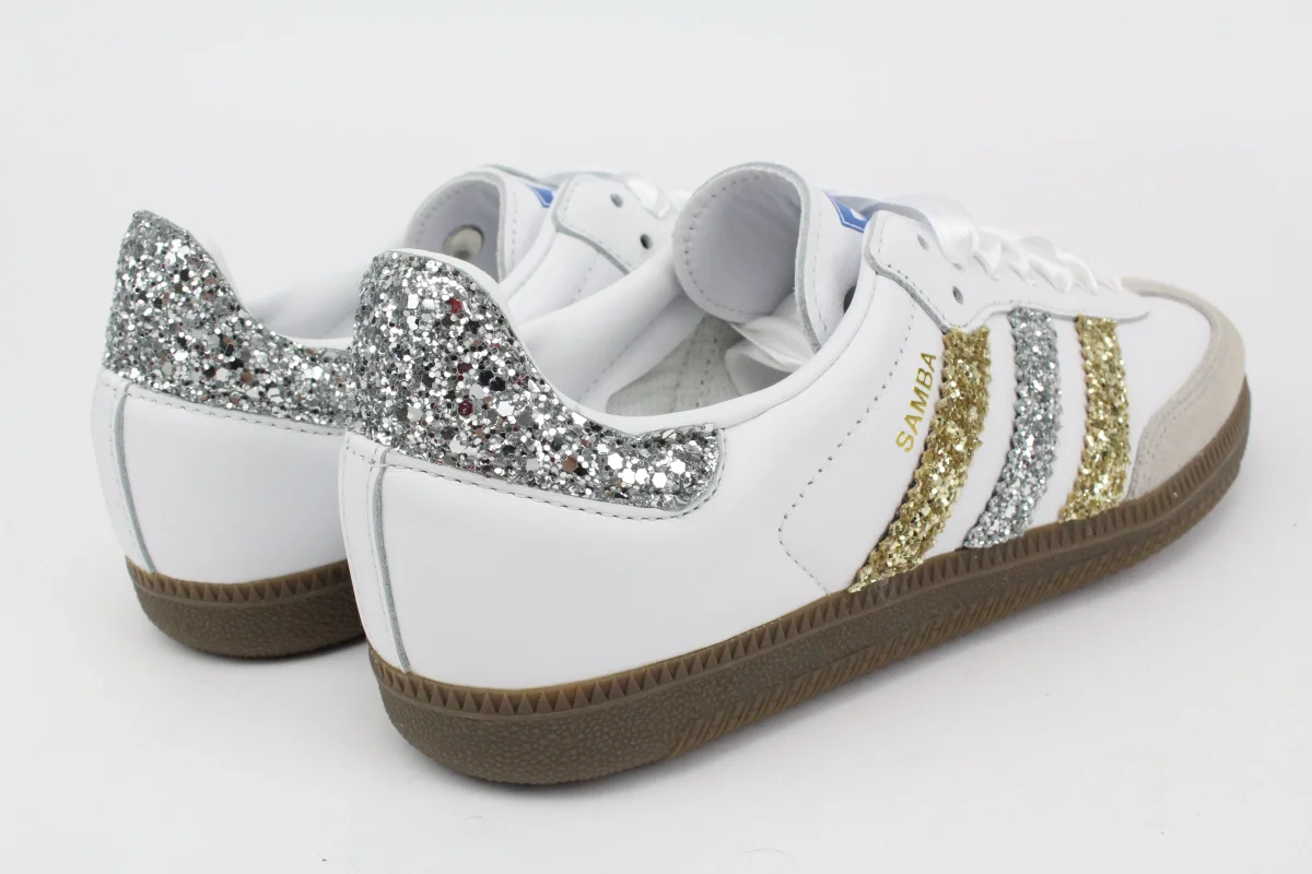 Scarpe Adidas Original SAMBA personalizzate a mano con Bande Glitter Oro e Argento , tallone argento.