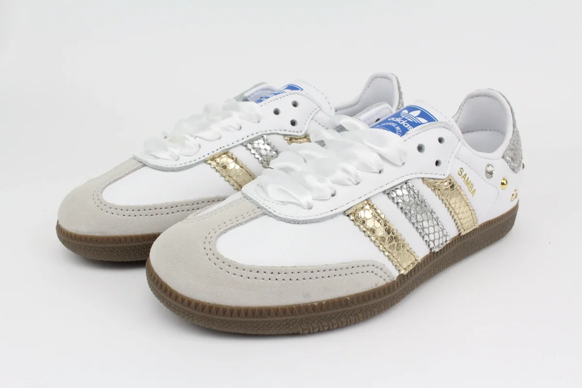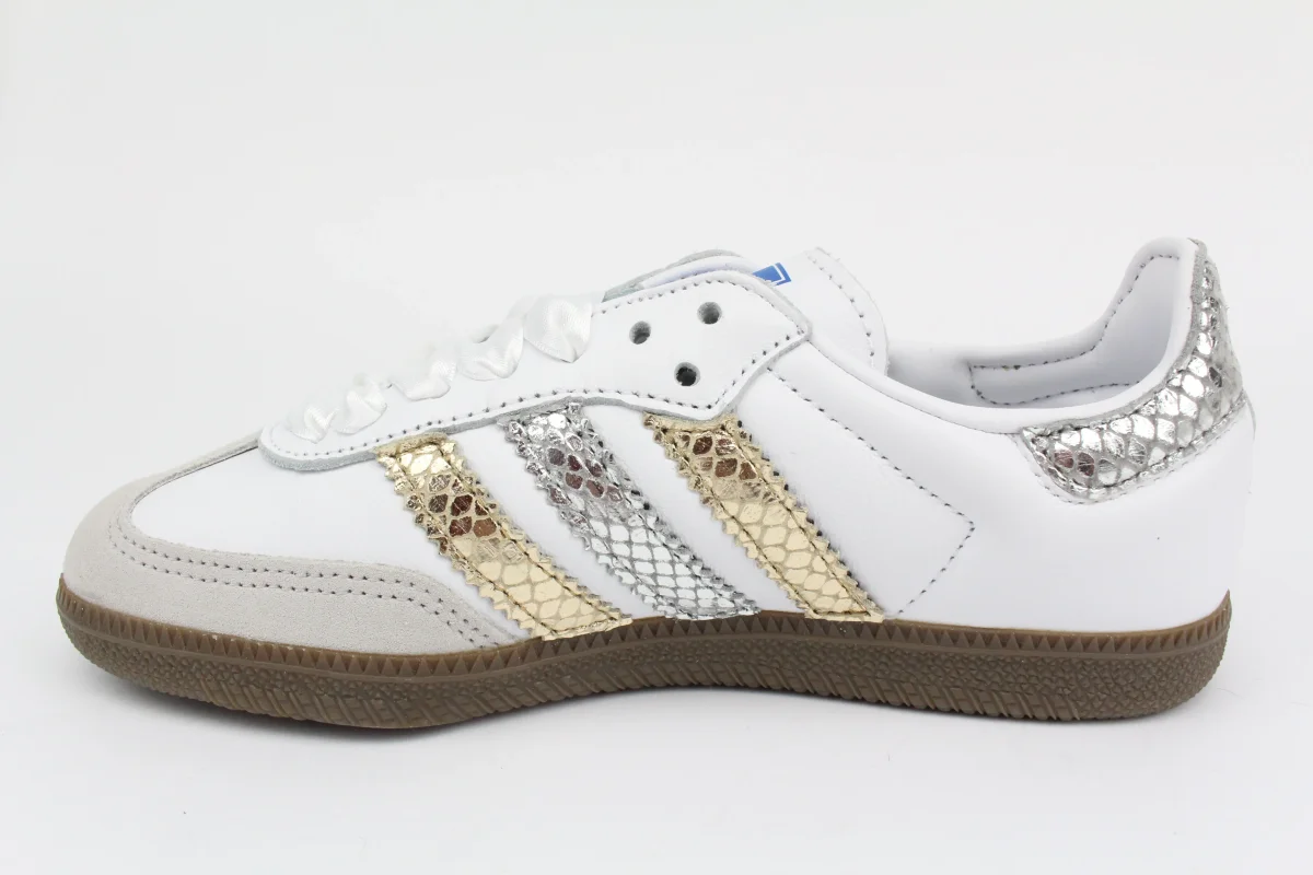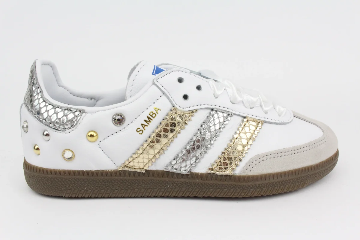 Scarpe Adidas Original SAMBA personalizzate a mano con Bande Pitonr Oro e Argento , tallone pitone argento, impreziosite da borchie e strass esterne. Ogni eventuale imperfezione è frutto del lavoro svolto artigianalmente. Laccio Originale Samba e laccio in raso bianco