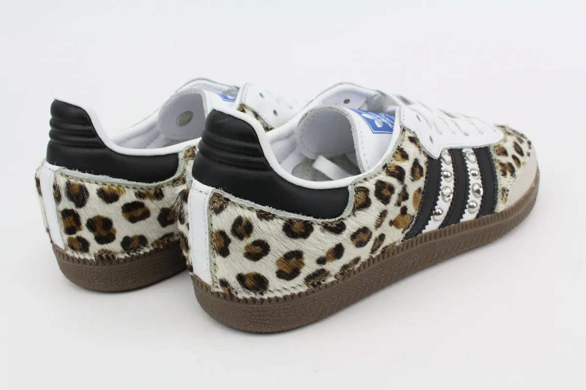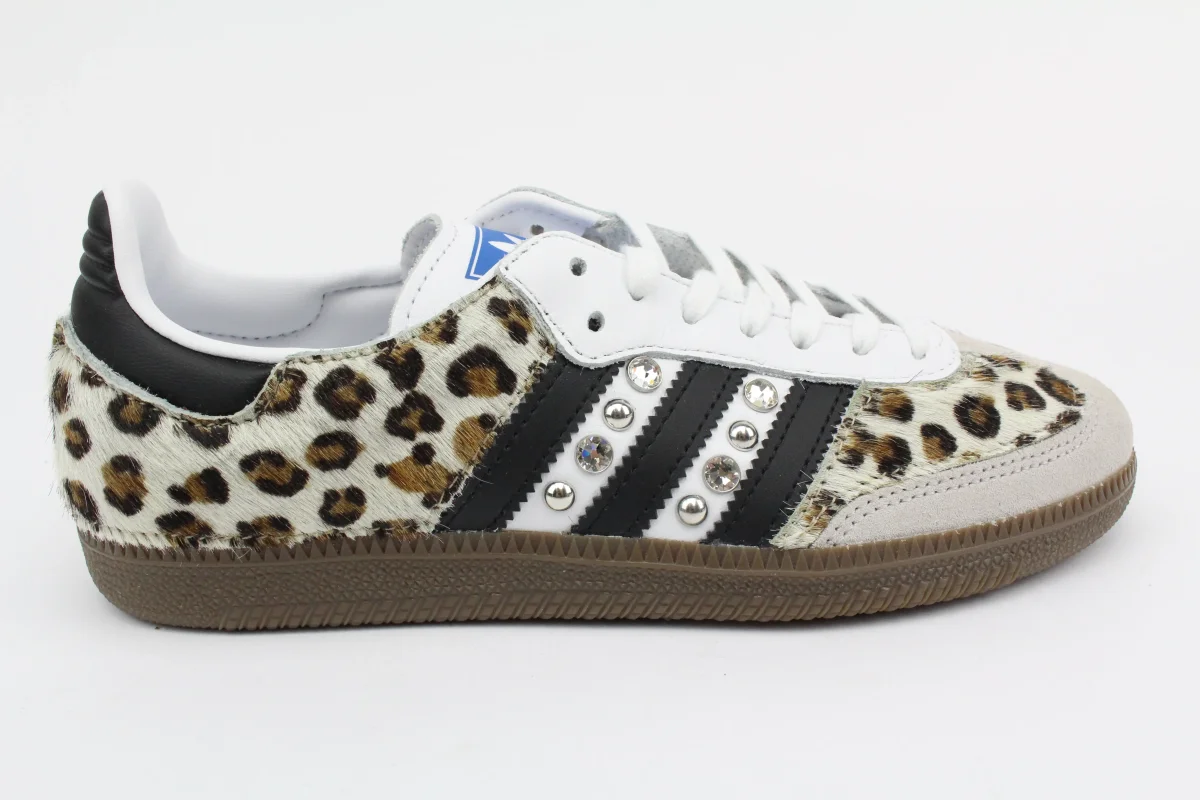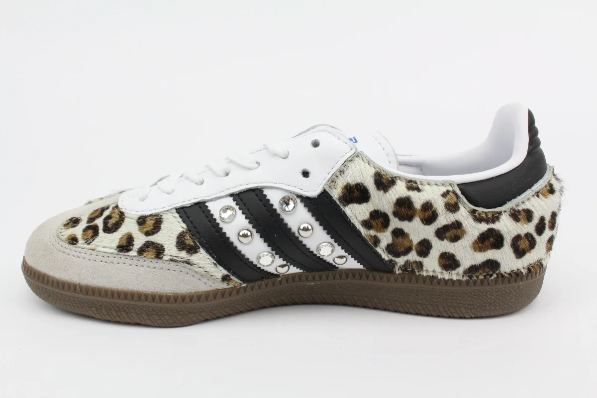 Scarpe Adidas Original SAMBA personalizzate a mano con cavallino maculato vera pelle e borchie & strass argento.