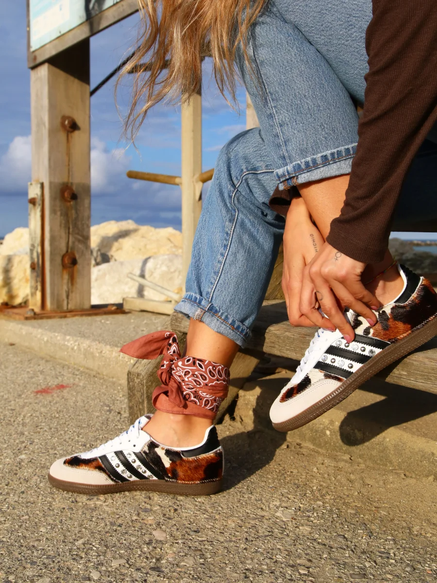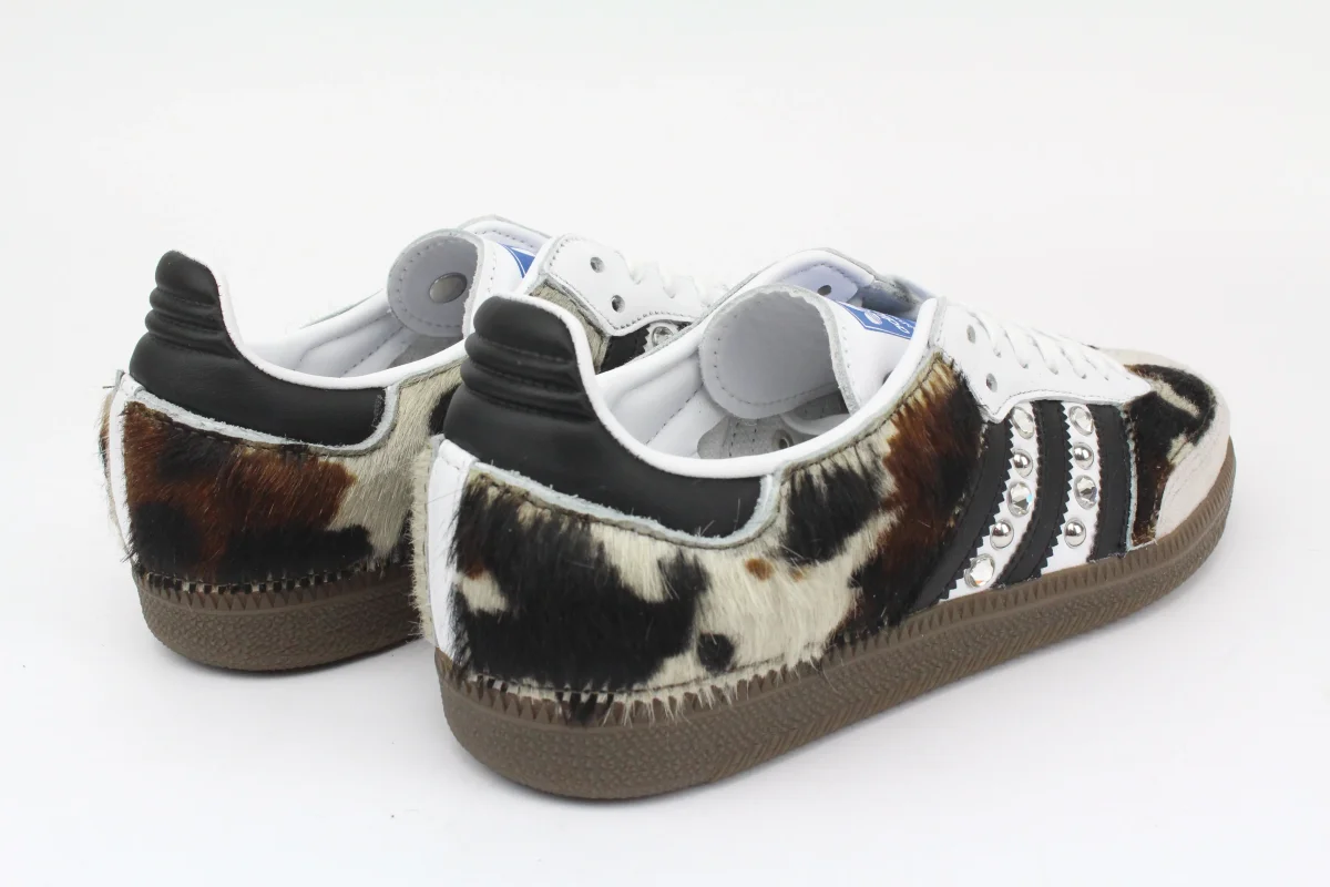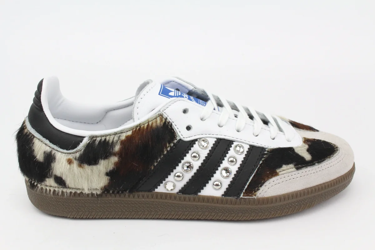 Scarpe Adidas Original SAMBA personalizzate a mano con cavallino mucca vera pelle e borchie & strass Argento. Ogni eventuale imperfezione è frutto del lavoro svolto artigianalmente.