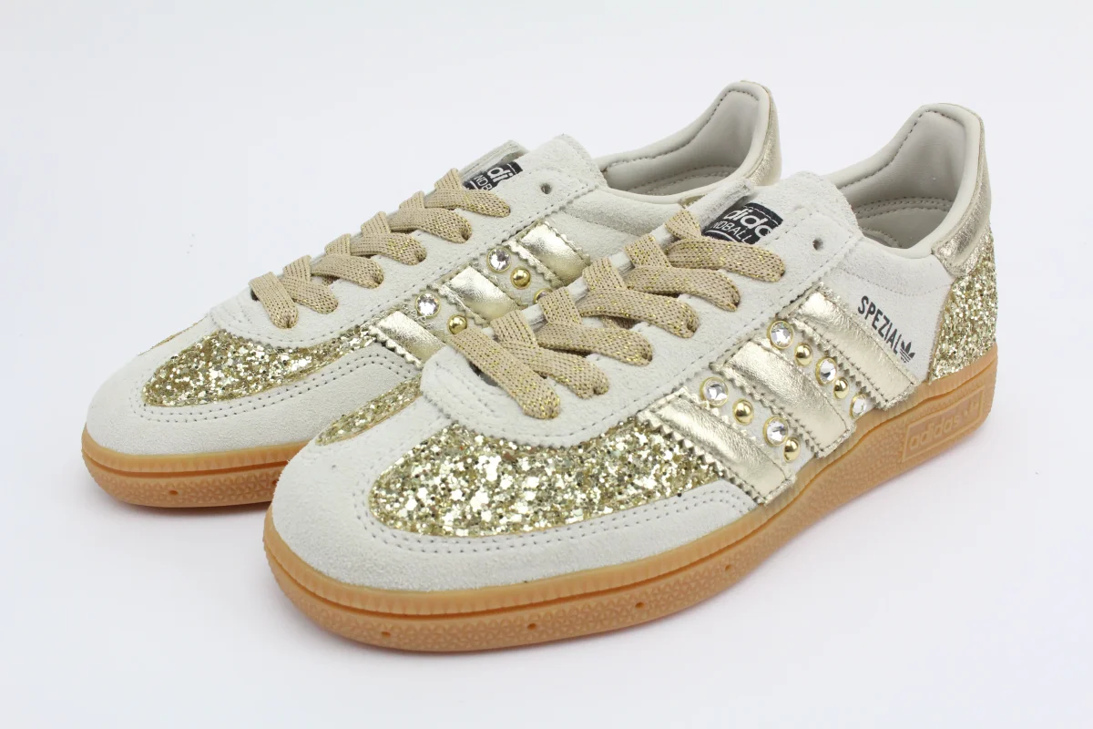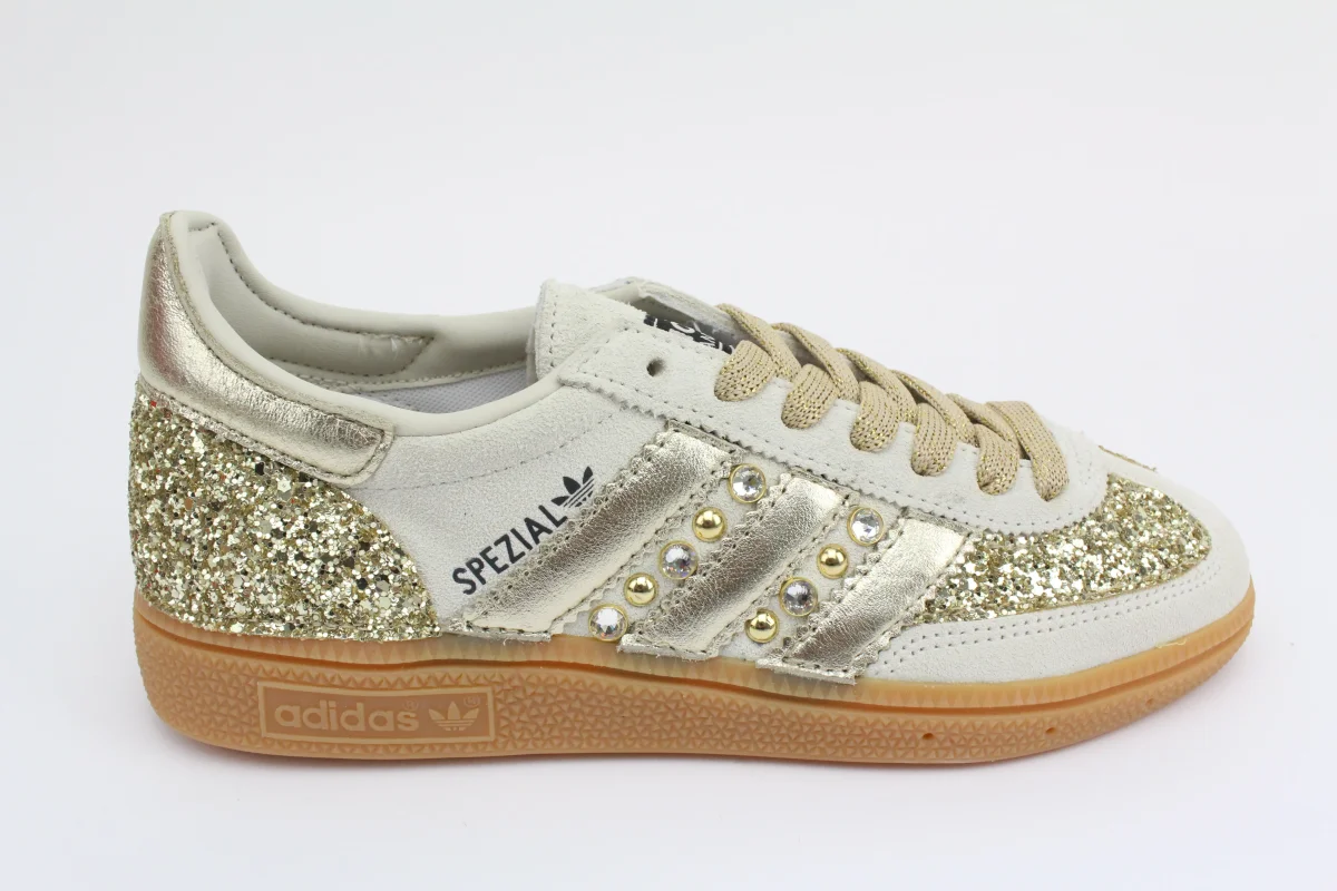 Scarpe Adidas Original SPEZIAL colore di base ALUMIN/CBLACK personalizzate con applicazioni di glitter su tallone e punta , tallone e bande in laminato oro, impreziosite da borchie e strass sempre oro.