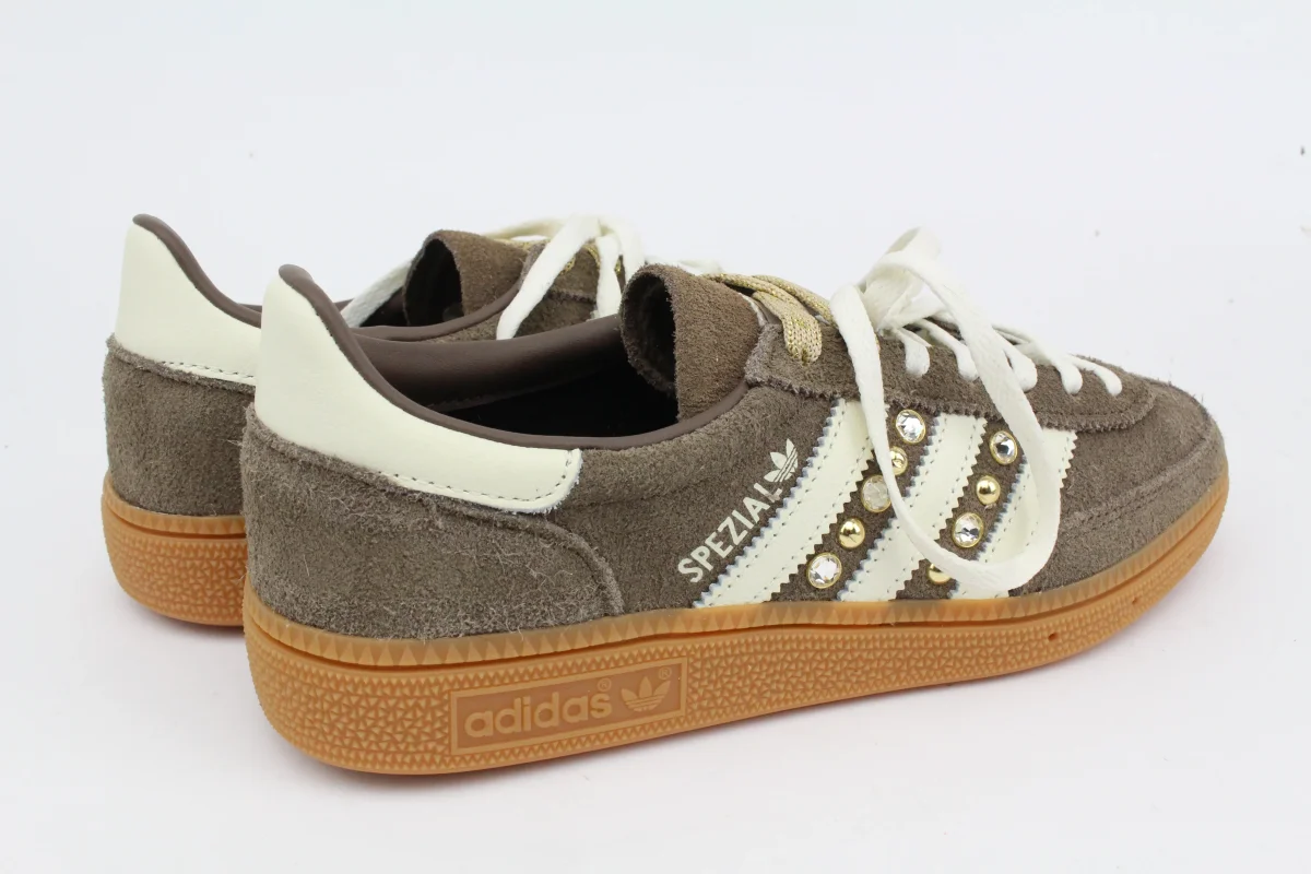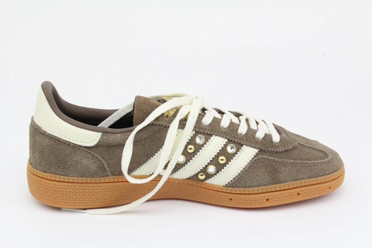 Scarpe Adidas Original SPEZIAL Marroni con bande color panna personalizzate con borchie e strass oro tra le bande.