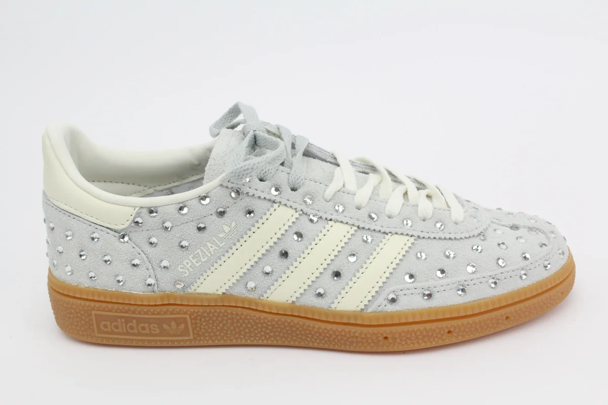 Scarpe Adidas Original SPEZIAL colore di base WONSIL/OWHITE personalizzate con applicazioni sulle pareti di Strass Swarovski Termosaldati Cristal. Ogni imperfezione รจ frutto del lavoro svolto artigianalmente. Laccio originale Spezial in scatola.