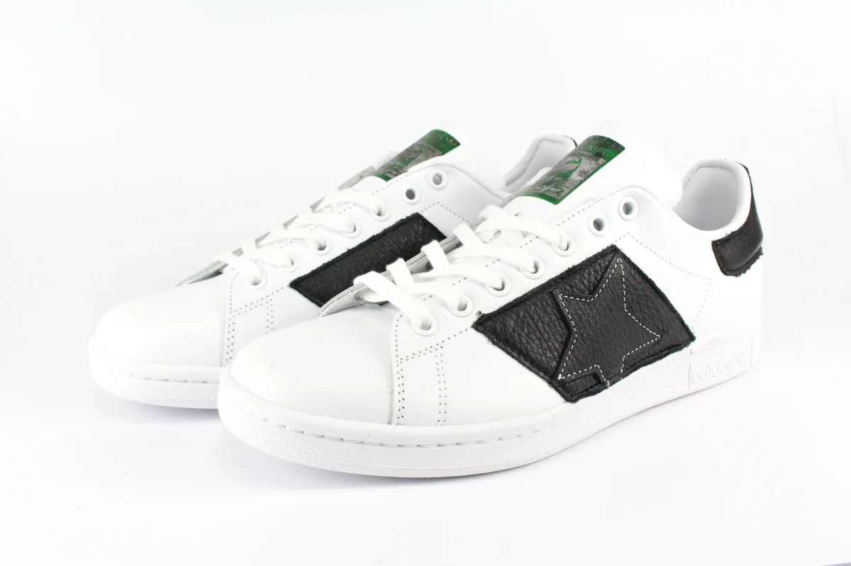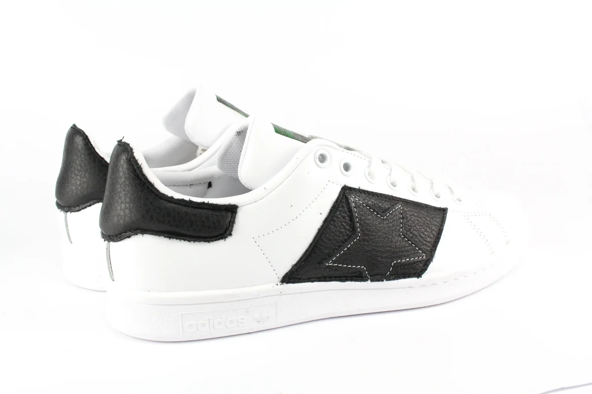 Sneakers originali Adidas Stan Smith personalizzate a mano con applicazione di pelle nera sagomata con profili bianchi a stella sulle pareti laterali e sul tallone. Effetto sporcato.