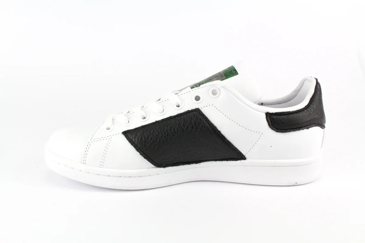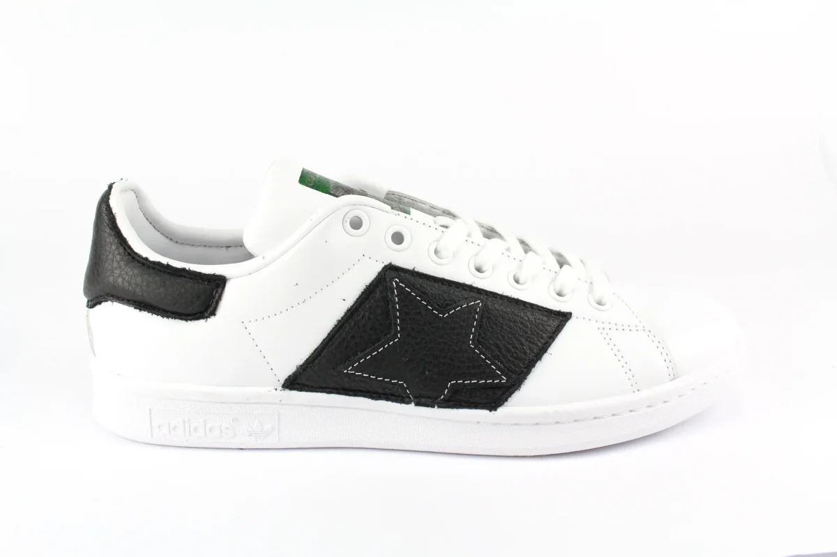 Sneakers originali Adidas Stan Smith personalizzate a mano con applicazione di pelle nera sagomata con profili bianchi a stella sulle pareti laterali e sul tallone. Effetto sporcato. Ogni eventuale imperfezione è frutto del lavoro svolto artigianalmente.