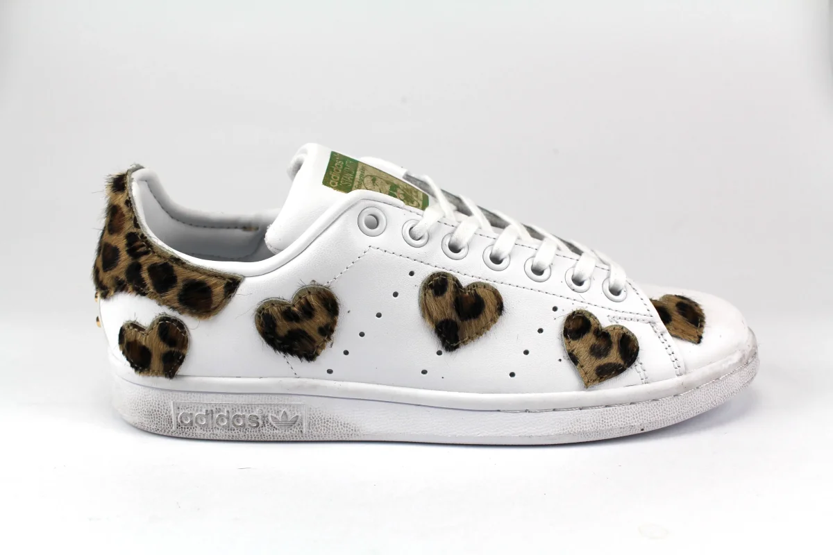Scarpe originali Adidas Stan Smith personalizzate a mano con applicazioni di cuoricini di cavallino maculato cucite sulla parte laterale esterna della scarpa e sul tallone. Due borchie oro sul tallone. Suola con effetto sporcato. Ogni eventuale imperfezione è frutto del lavoro svolto artigianalmente.