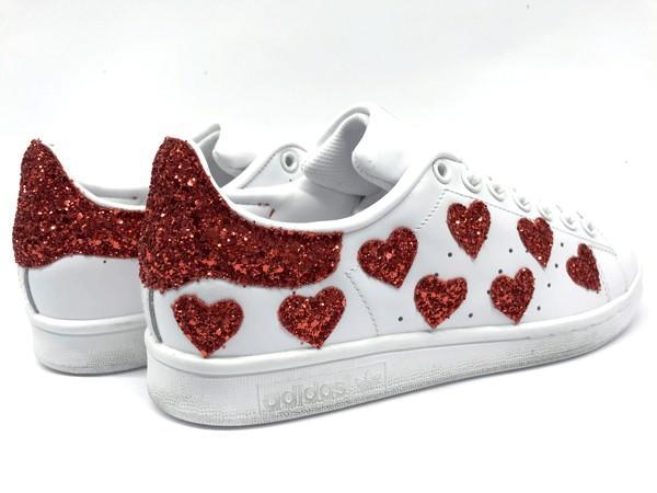 Adidas Stan Smith con applicazione di cuori in glitter rosso, cuciti a mano, sulla parete esterna della scarpa. Tallone rivestito in glitter rosso. Ogni imperfezione è frutto del lavoro svolto artigianalmente.