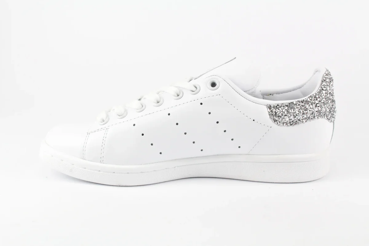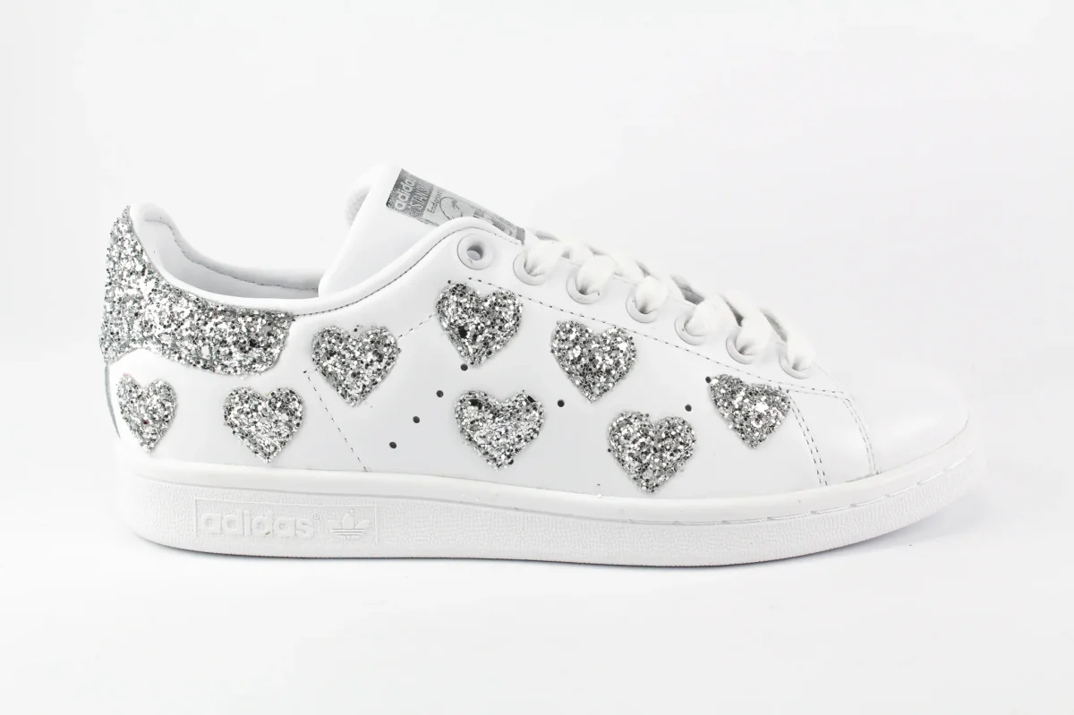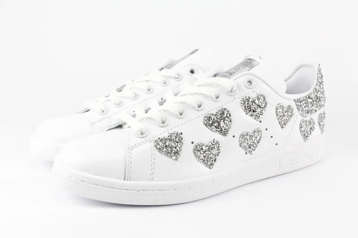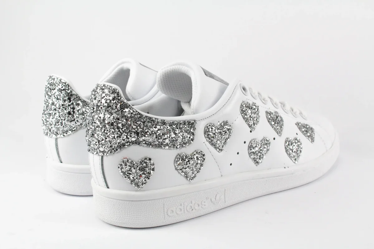 Scarpe originali Adidas Stan Smith personalizzate a mano con applicazione di cuoricini in glitter argento cuciti sulla parete esterna della scarpa. Tallone rivestito in glitter argento.