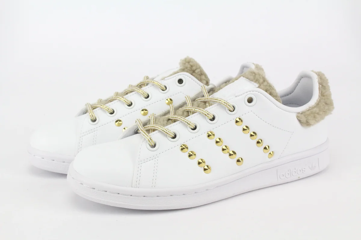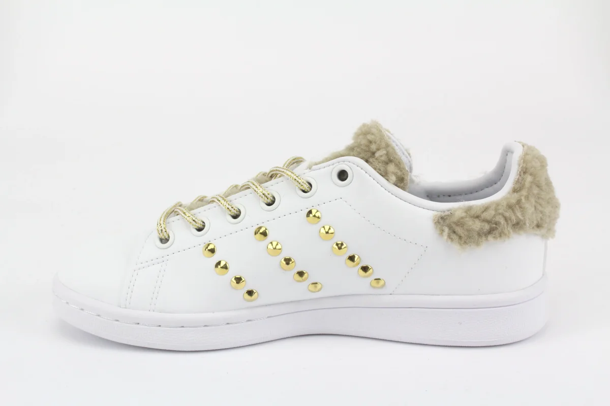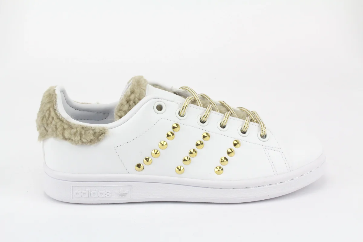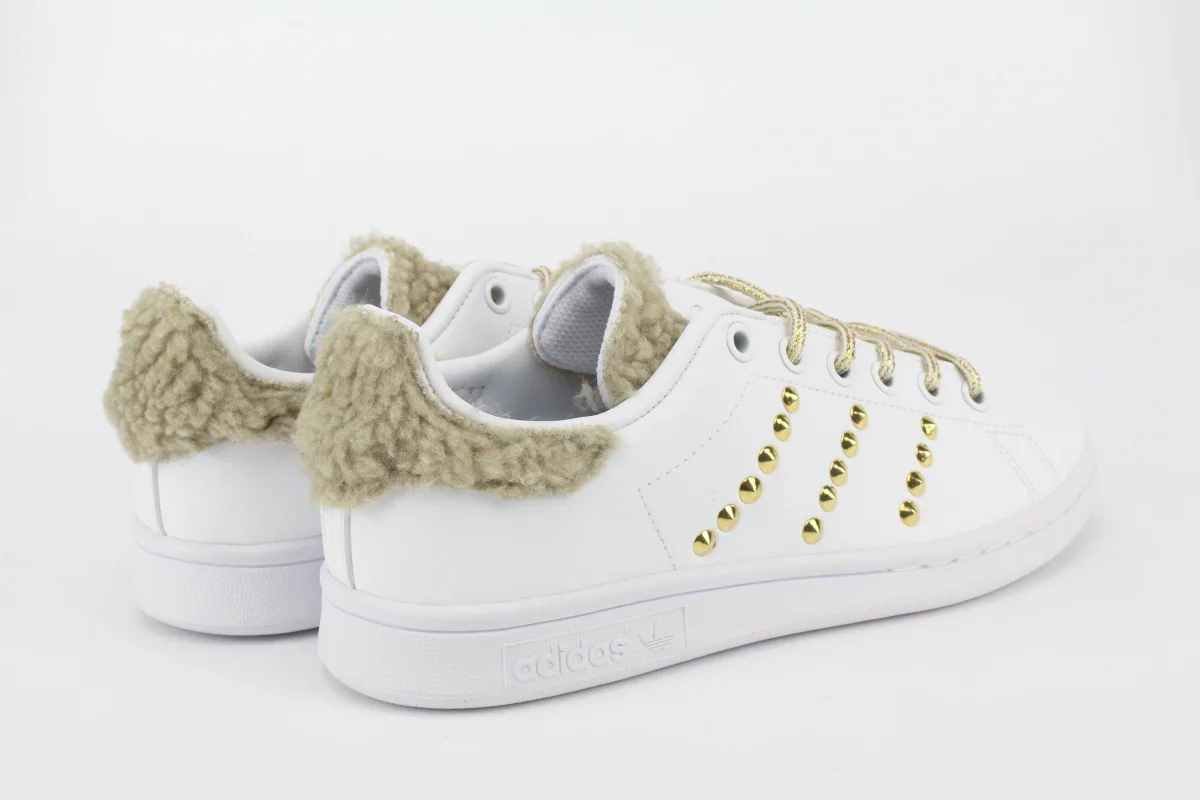 Scarpe originali Adidas Stan Smith personalizzate a mano con applicazione di Lamb Beige su tallone e linguetta e borchie a piramide Oro sulle pareti.