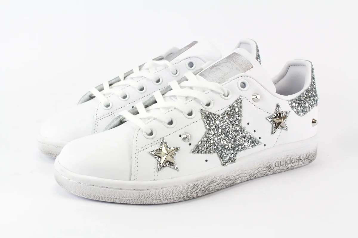 Scarpe originali Adidas Stan Smith personalizzate a mano con applicazione di stella e stelline glitter argento sulle pareti laterali e glitter dello stesso colore sul tallone. Applicate borchie a stella e borchie a cono. Ogni imperfezione è frutto del lavoro svolto artigianalmente.