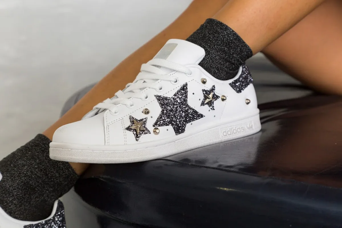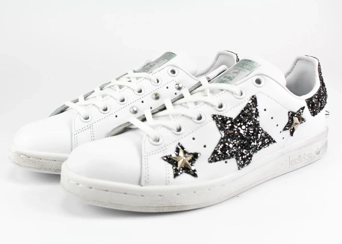Scarpe originali Adidas Stan Smith personalizzate a mano con applicazione di stella e stelline glitter colore black silver sulle pareti esterne e borchie sulle pareti interne. Tallone ricoperto di glitter black silver. Applicate borchie a stella e borchie a cono. Ogni imperfezione è frutto del lavoro svolto artigianalmente.