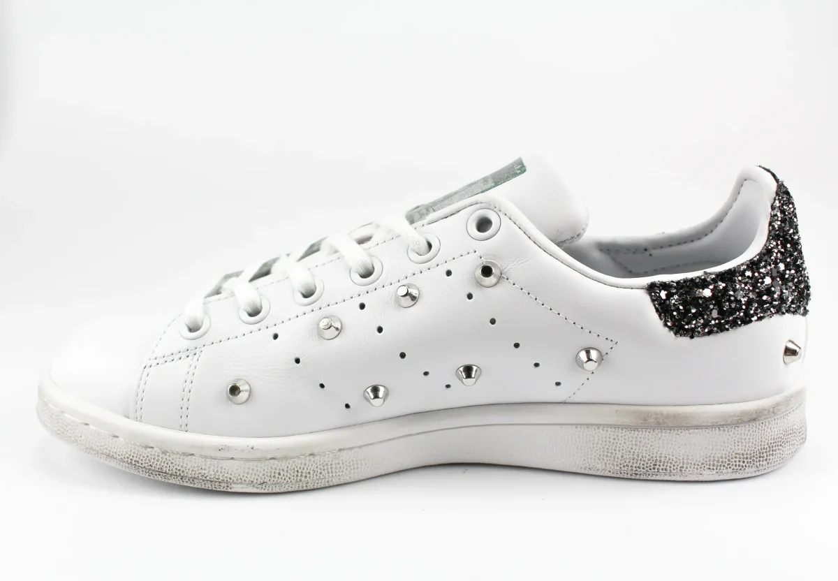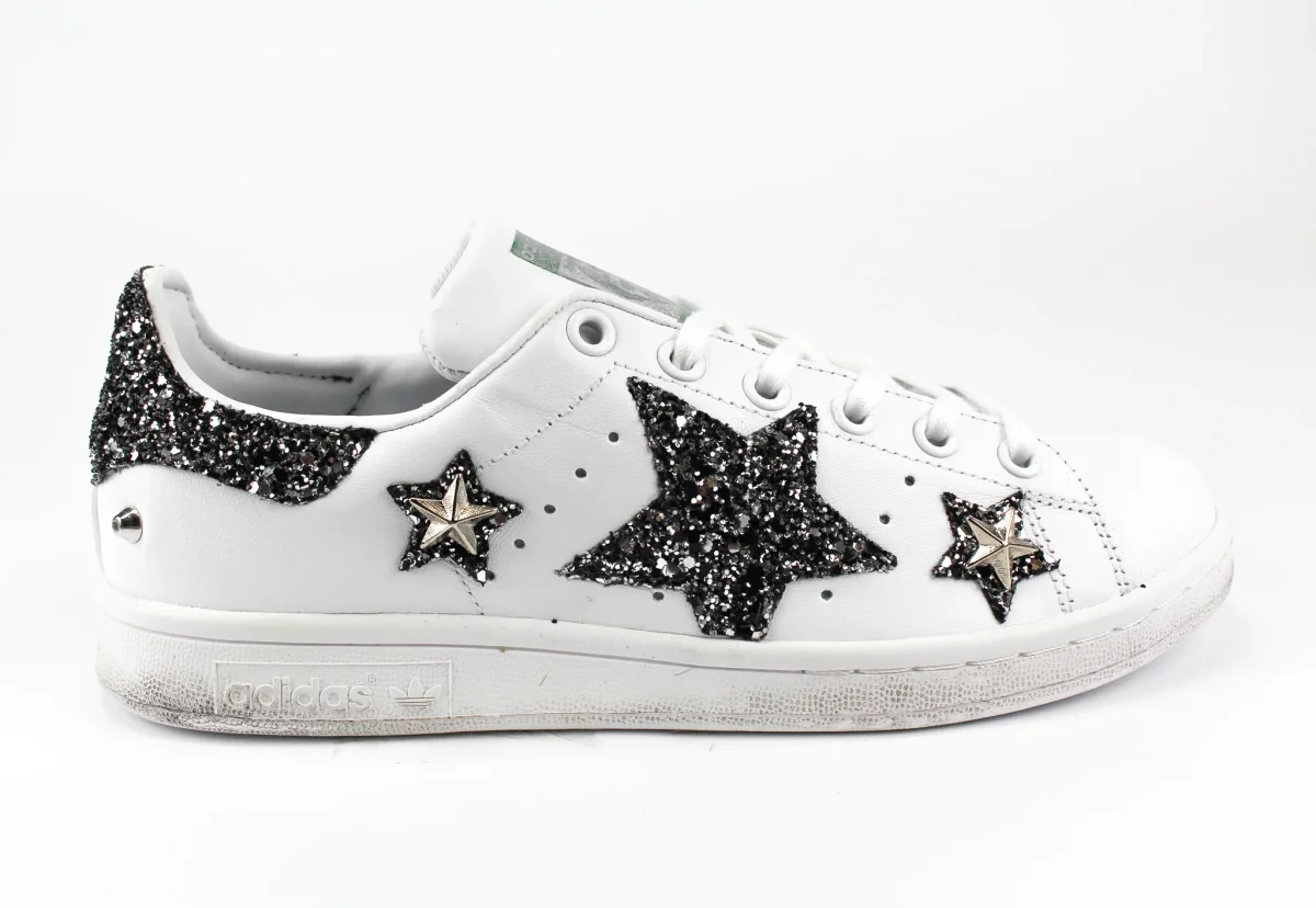 Scarpe originali Adidas Stan Smith personalizzate a mano con applicazione di stella e stelline glitter colore black silver sulle pareti esterne e borchie sulle pareti interne. Tallone ricoperto di glitter black silver.