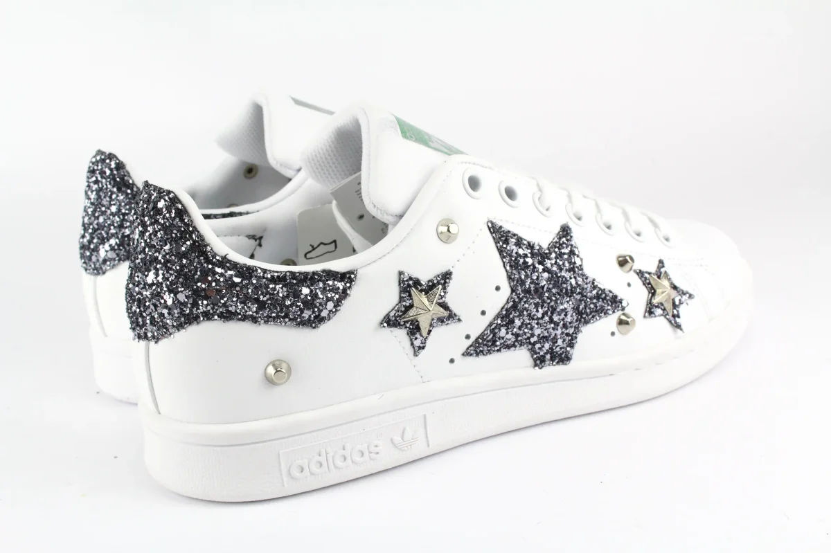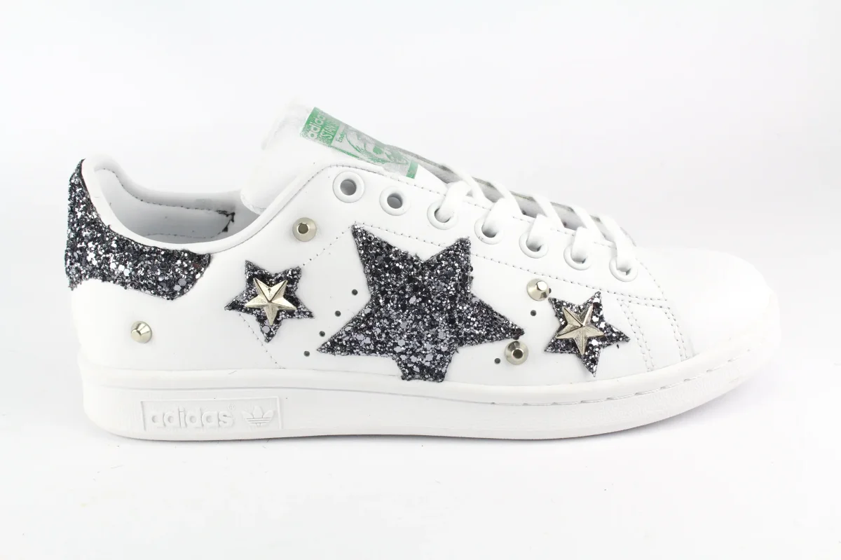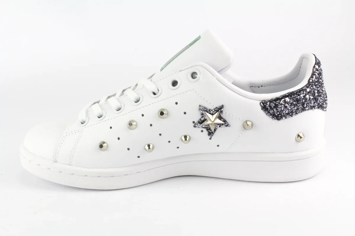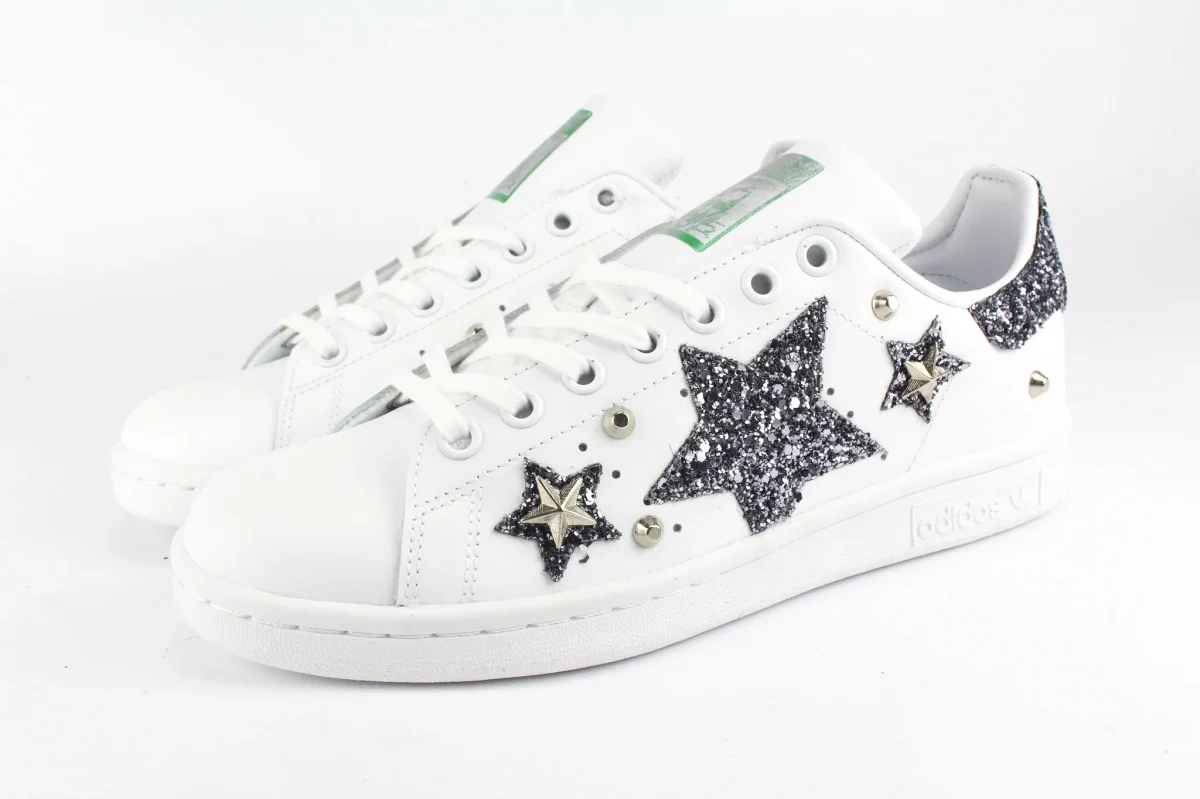 Scarpe originali Adidas Stan Smith personalizzate a mano con applicazione di stella e stelline glitter brunito sulle pareti laterali e glitter dello stesso colore sul tallone. Applicate borchie a stella e borchie a cono. Ogni imperfezione è frutto del lavoro svolto artigianalmente.