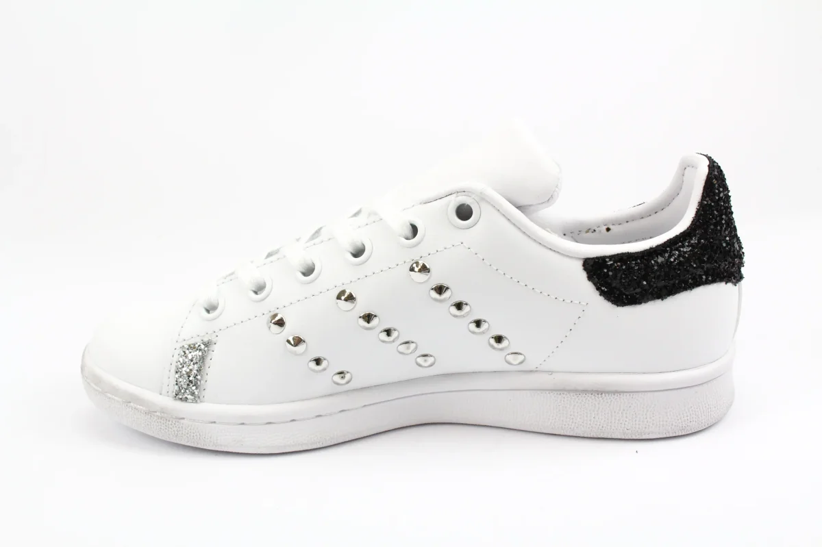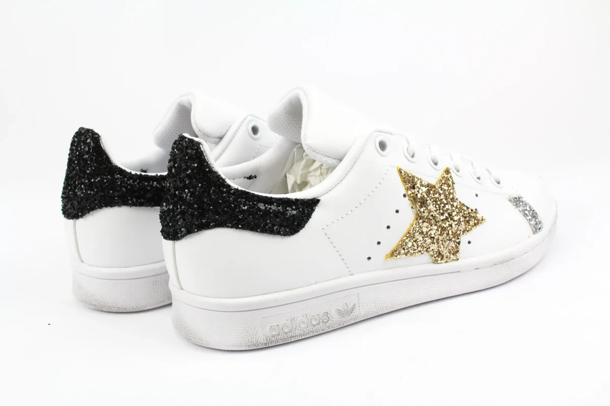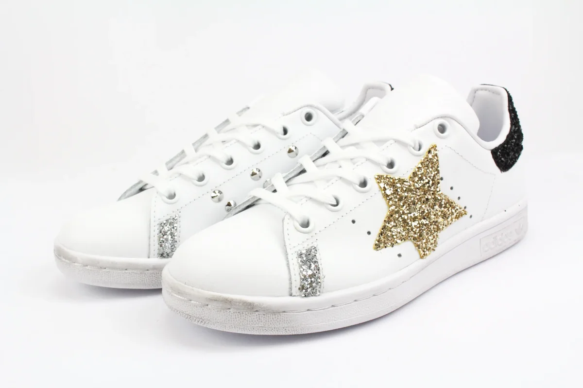 Scarpe originali Adidas Stan Smith personalizzate a mano con applicazione di stella glitter oro sulla parete esterna, tallone glitter nero, inserto glitter argento in punta. Borchie argento applicate sulla parete interna. Effetto sporcato.
