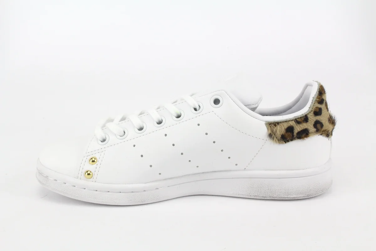Scarpe originali Adidas Stan Smith personalizzate a mano con applicazioni di cavallino maculato a forma di stella sulla parete laterale esterna e sul tallone e strass e borchie oro.