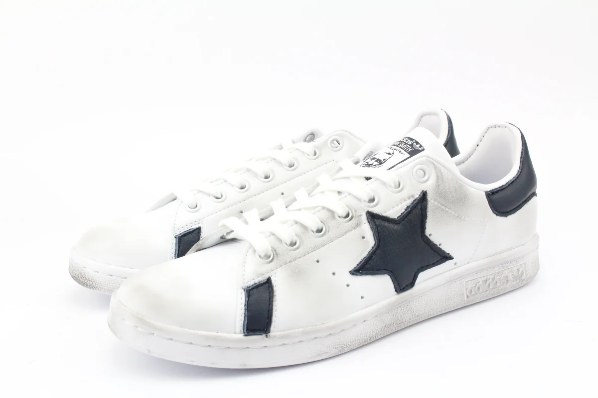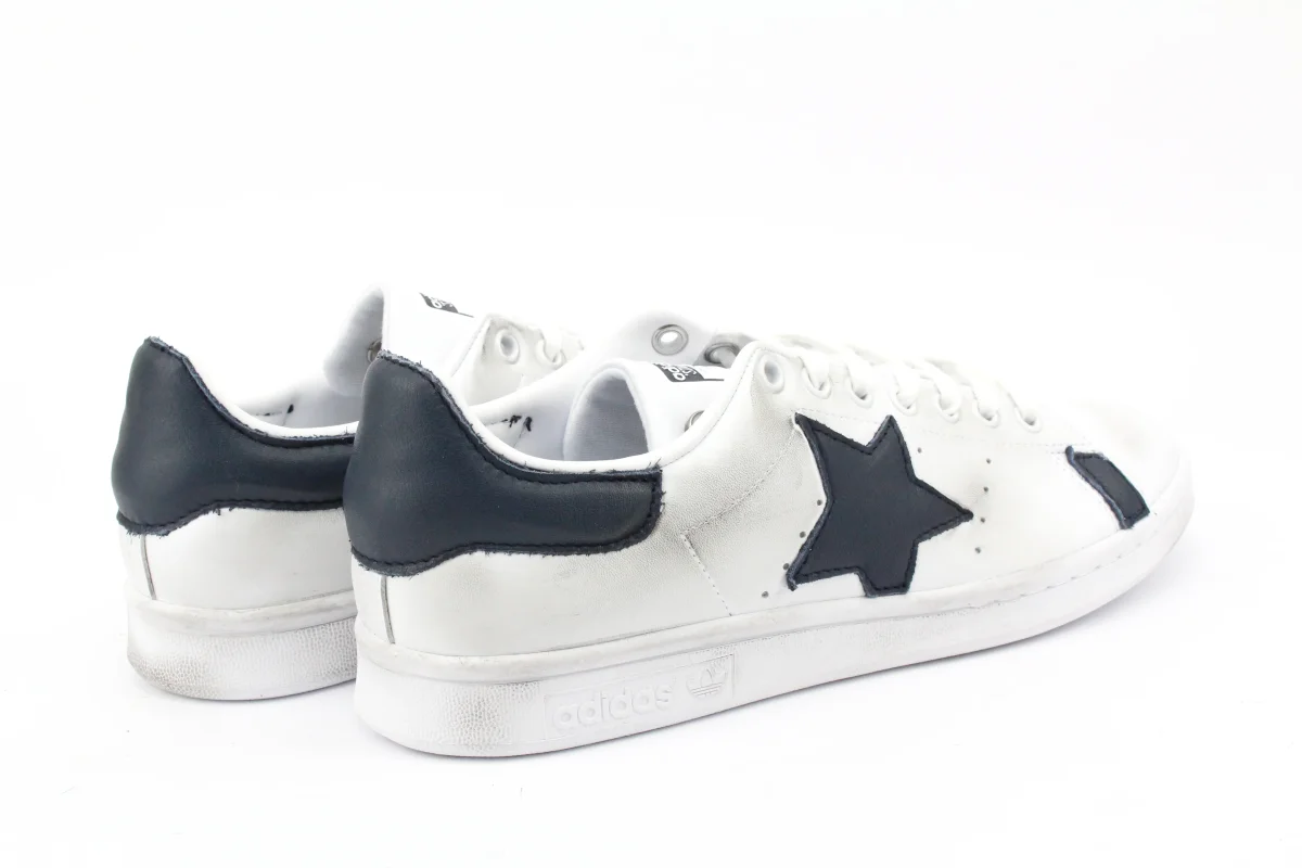 Scarpe originali Adidas Stan Smith personalizzate a mano con applicazione di stella in pelle blue e pelle blue su tallone e parete laterale. Effetto sporcato.