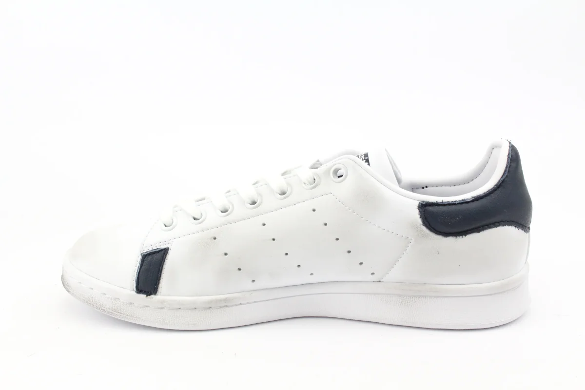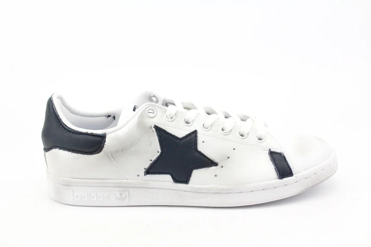 Scarpe originali Adidas Stan Smith personalizzate a mano con applicazione di stella in pelle blue e pelle blue su tallone e parete laterale. Effetto sporcato. Ogni eventuale imperfezione è frutto del lavoro svolto artigianalmente.