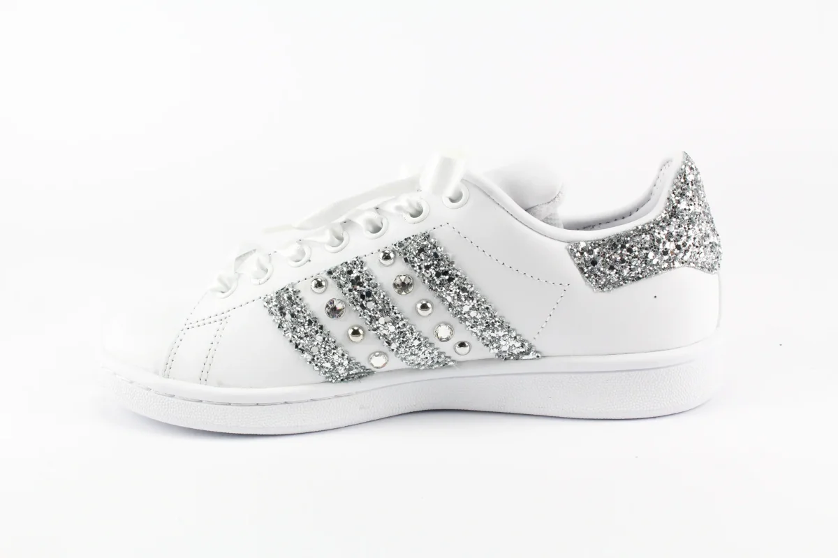 Scarpe originali Adidas Stan Smith b personalizzate a mano con applicazione di glitter argento, borchie e strass sulle bande laterali delle sneakers. Tallone ricoperto di glitter argento. Lacci in raso bianco.