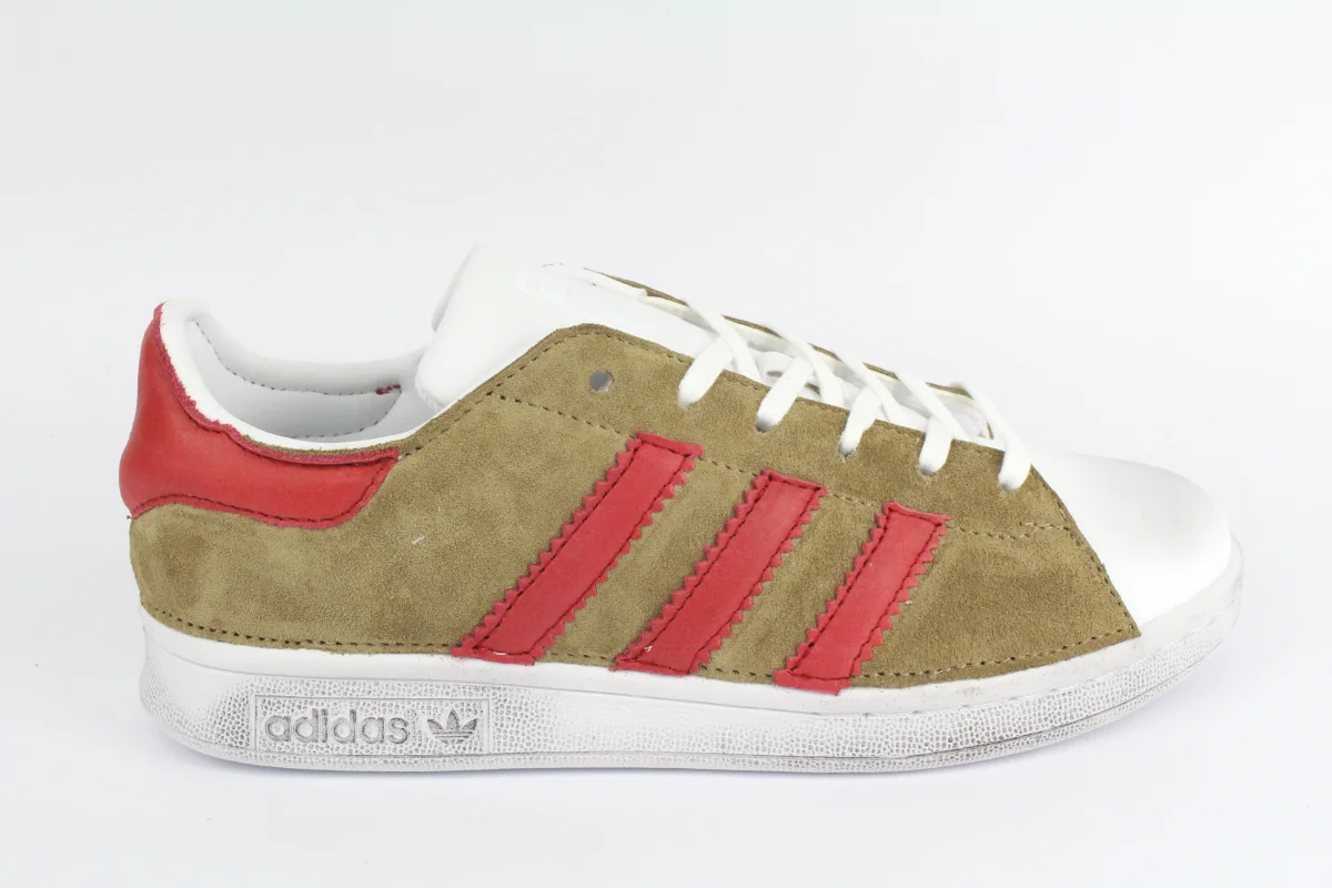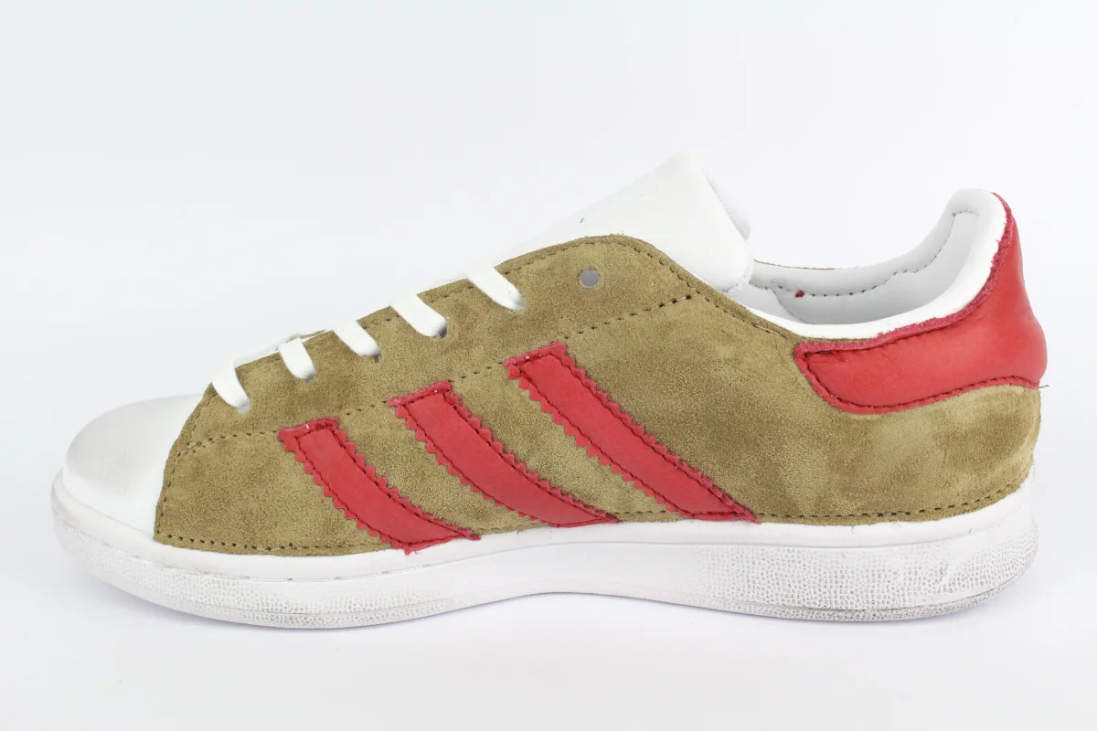 Sneakers originali Adidas Stan Smith personalizzate a mano, con applicazione di total camoscio Color Tabacco, arricchite da pelle Rossa su tallone e laterali. Ogni imperfezione è frutto del lavoro svolto artigianalmente. Laccio Originale Adidas bianco
