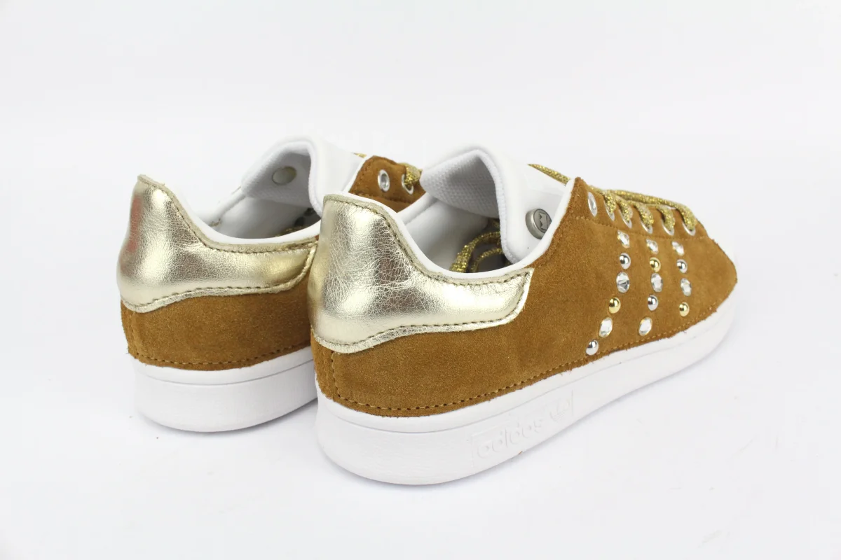 Sneakers originali Adidas Stan Smith personalizzate a mano, con applicazione di total camoscio Color Tabacco, arricchite da pelle su tallone in laminato oro impreziosita da applicazione di Strass e borchie laterali.