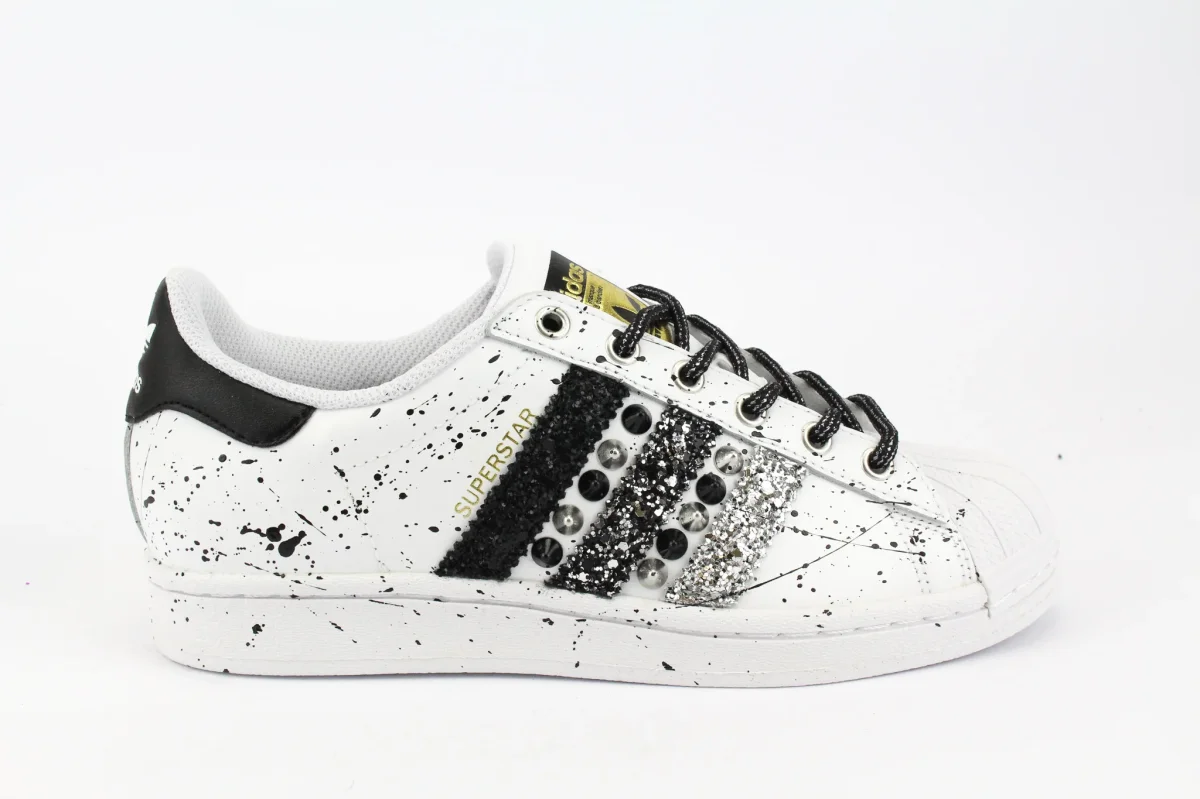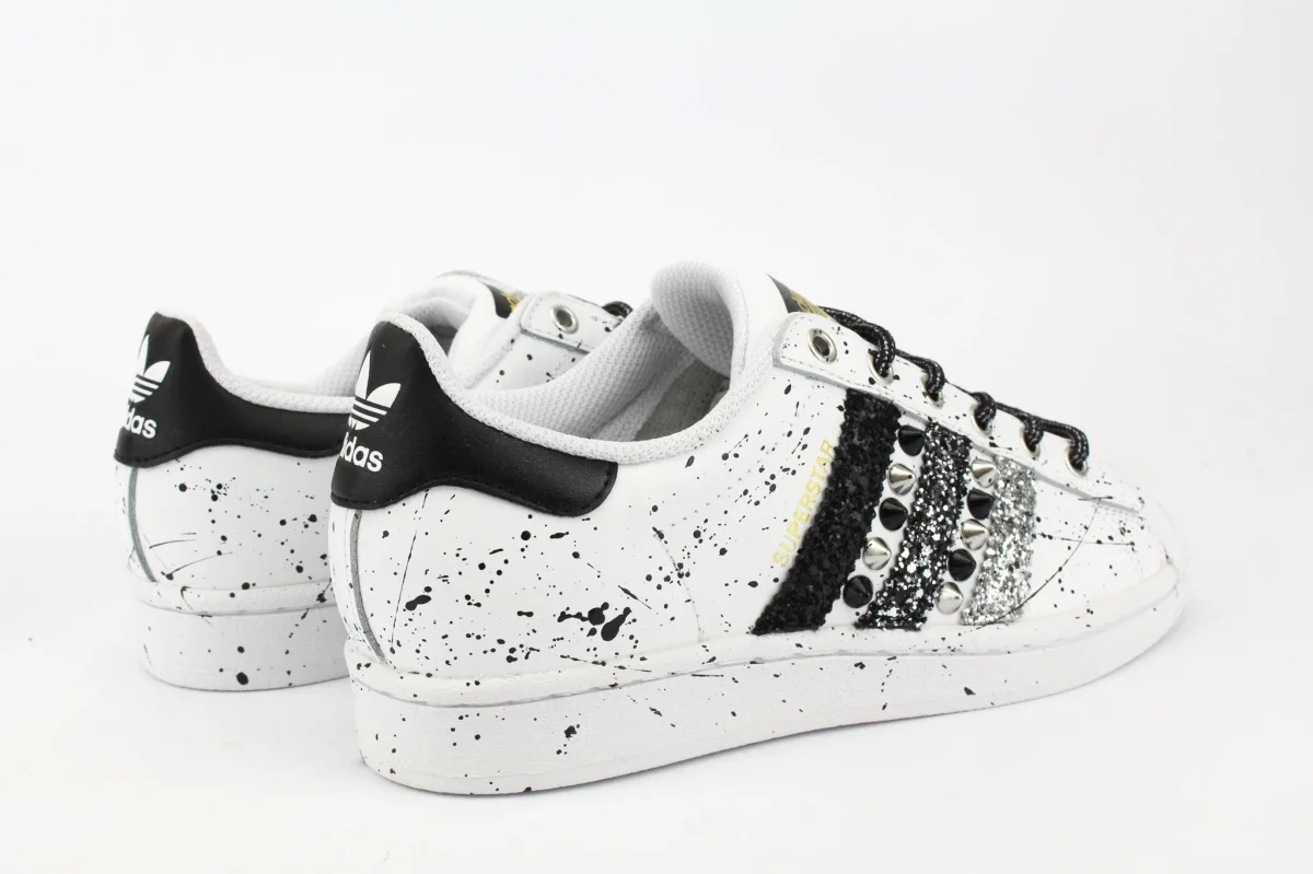 Sneakers originali Adidas Superstar personalizzate a mano con applicazione di glitter nero, black silver e argento sulle pareti laterali unito a borchie nere e argento e spruzzi di vernice nera su tutta la scarpa.