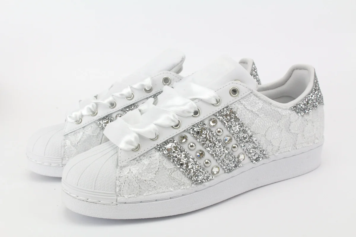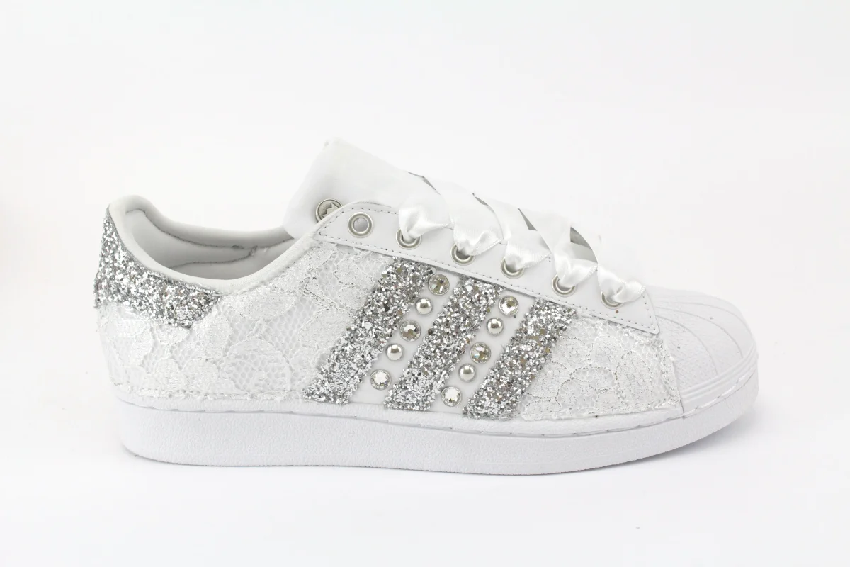 Sneakers original Adidas Superstar personalizzate a mano, con applicazione di pizzo White, glitter Argento. Arricchite da borchie e strass Swarovski in mezzo alle bande di glitter e tallone ricoperto in glitter oro.