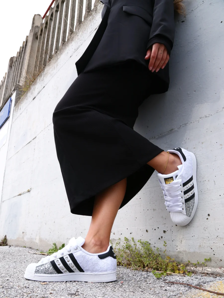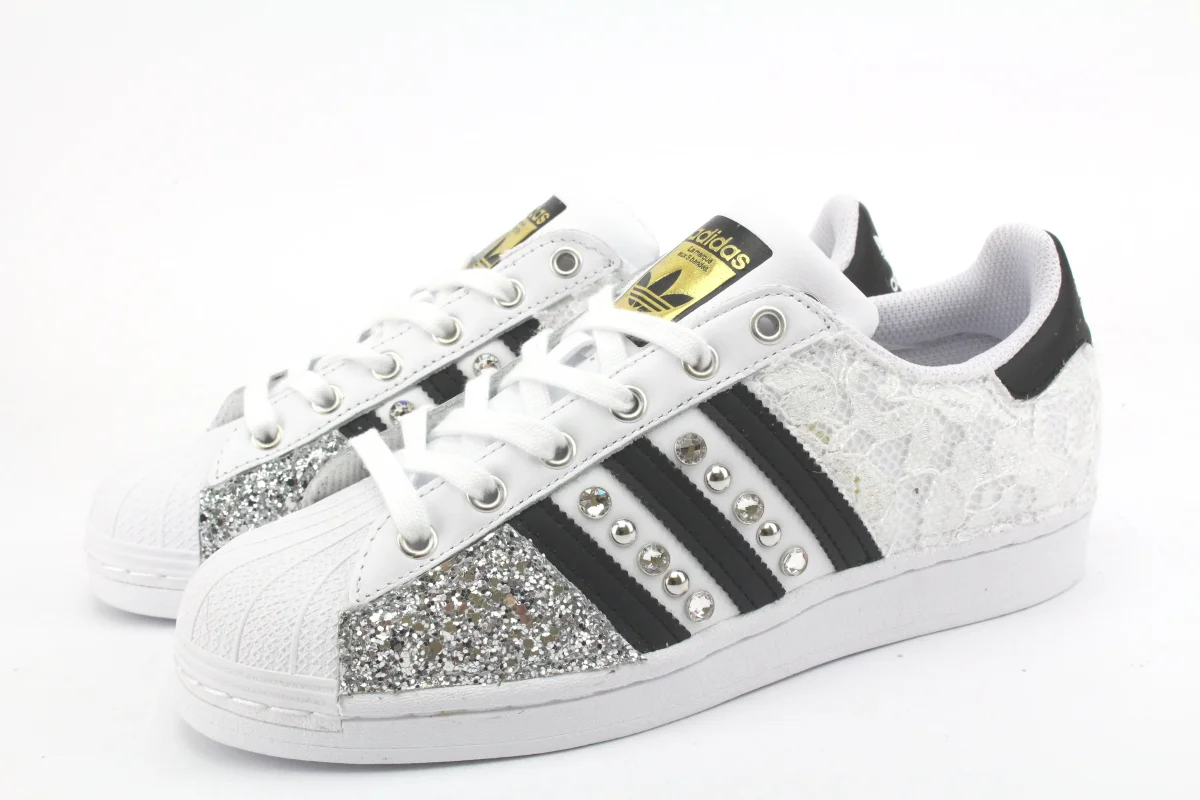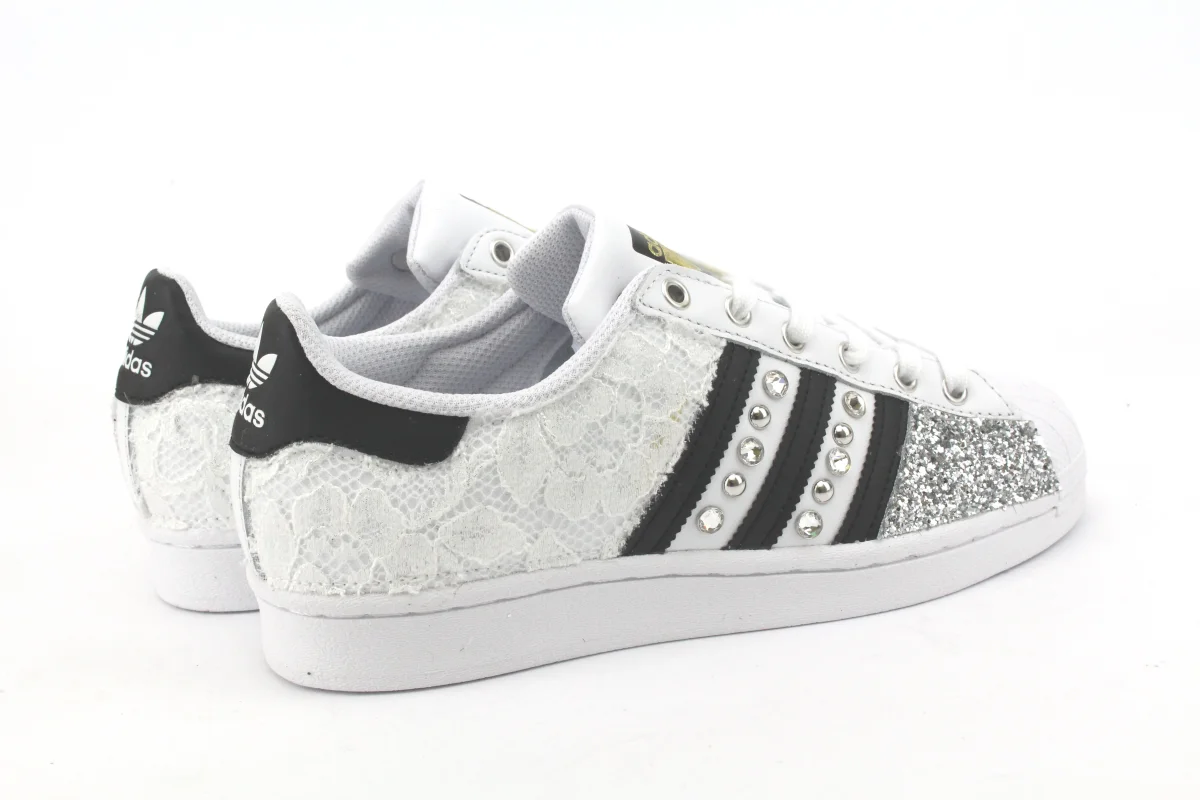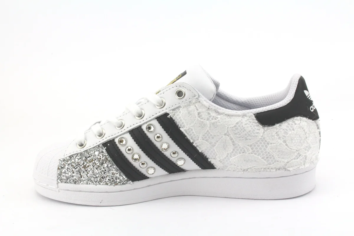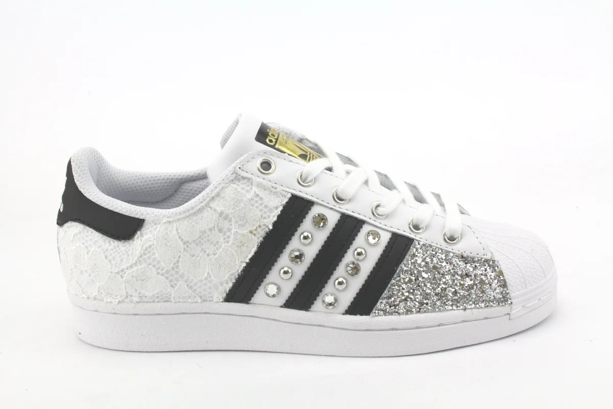 Sneakers original Adidas Superstar personalizzate a mano, con applicazione di pizzo White, glitter Argento. Arricchite da borchie e strass swarovski in mezzo alle bande di glitter.