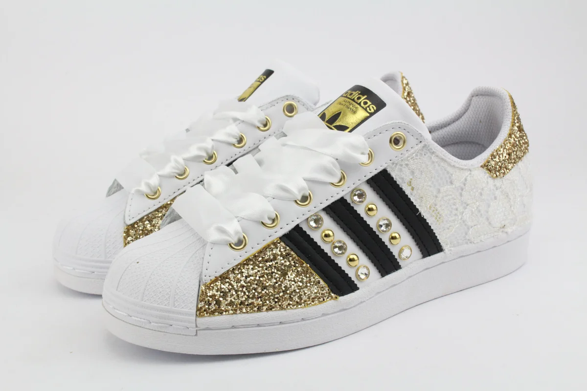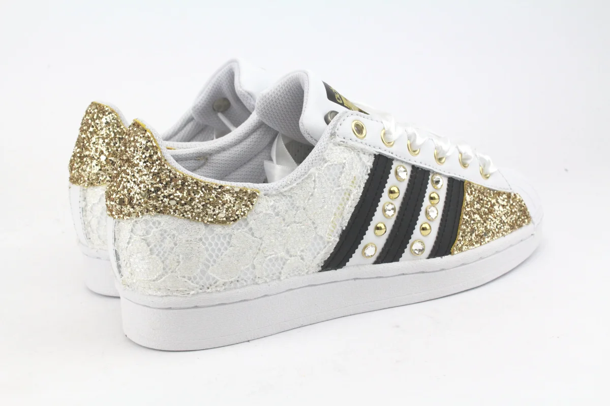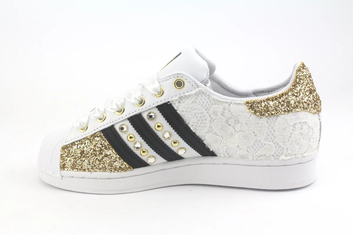Sneakers original Adidas Superstar personalizzate a mano, con applicazione di pizzo White, glitter Oro. Arricchite da borchie e strass Swarovski in mezzo alle bande originali nere e tallone ricoperto in glitter oro.