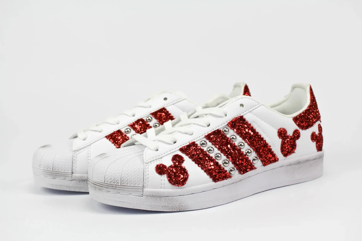 Scarpe originali Adidas Superstar personalizzate a mano applicazione di topolini glitter rossi e borchie sulle pareti laterali e sul tallone. Effetto sporcato. Ogni eventuale imperfezione è frutto del lavoro svolto artigianalmente.