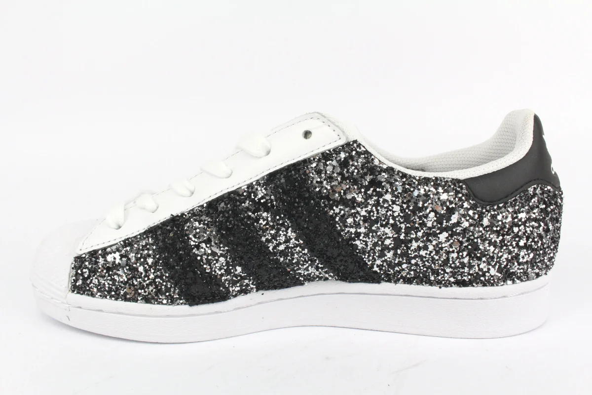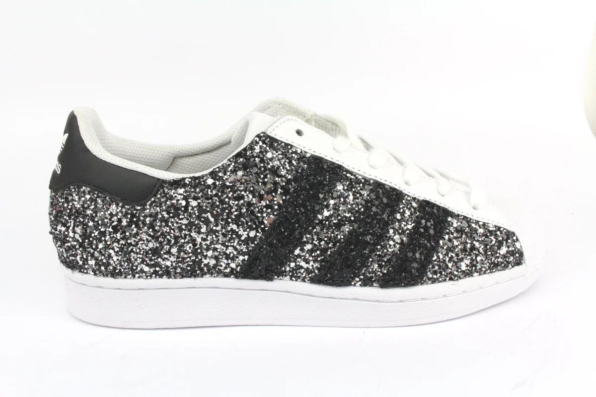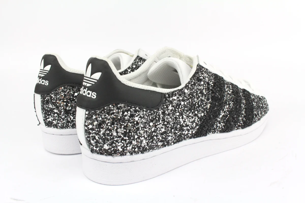 Scarpe originali Adidas Superstar personalizzate a mano con applicazione di glitter black silver sulle pareti esterne e strisce black glitter, tallone della sneakers lasciato originale Adidas.