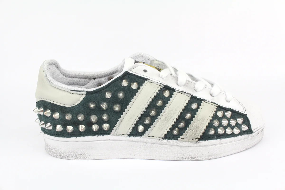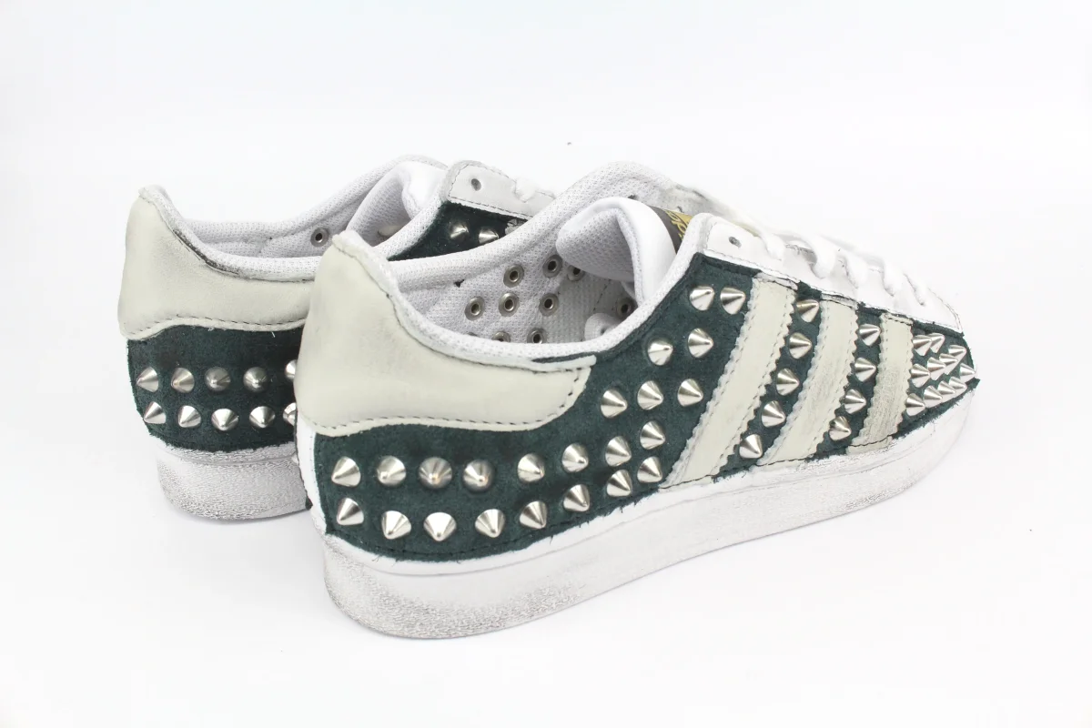 Sneakers Originali Adidas Superstar personalizzate a mano, con applicazione di Total camoscio Color Petrolio, arricchite da pelle su tallone e strisce Color Panna. Impreziosite da borchie a cono Nikel.