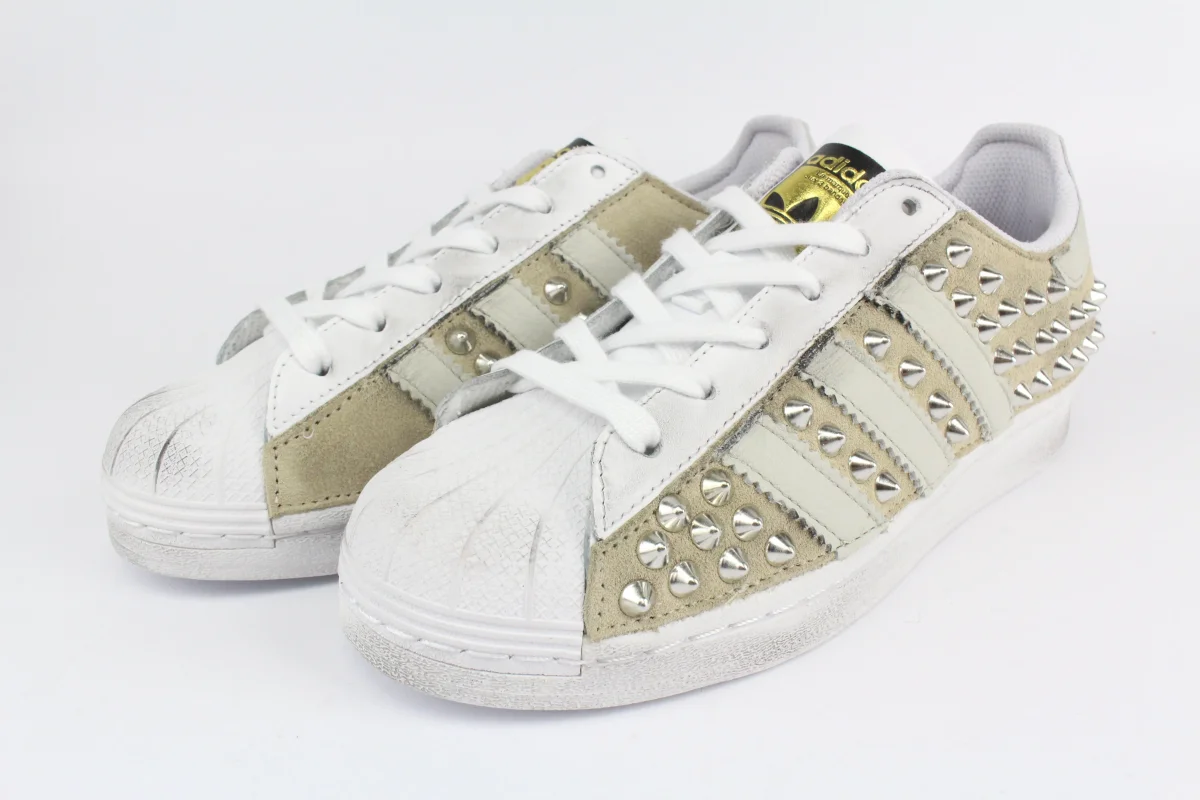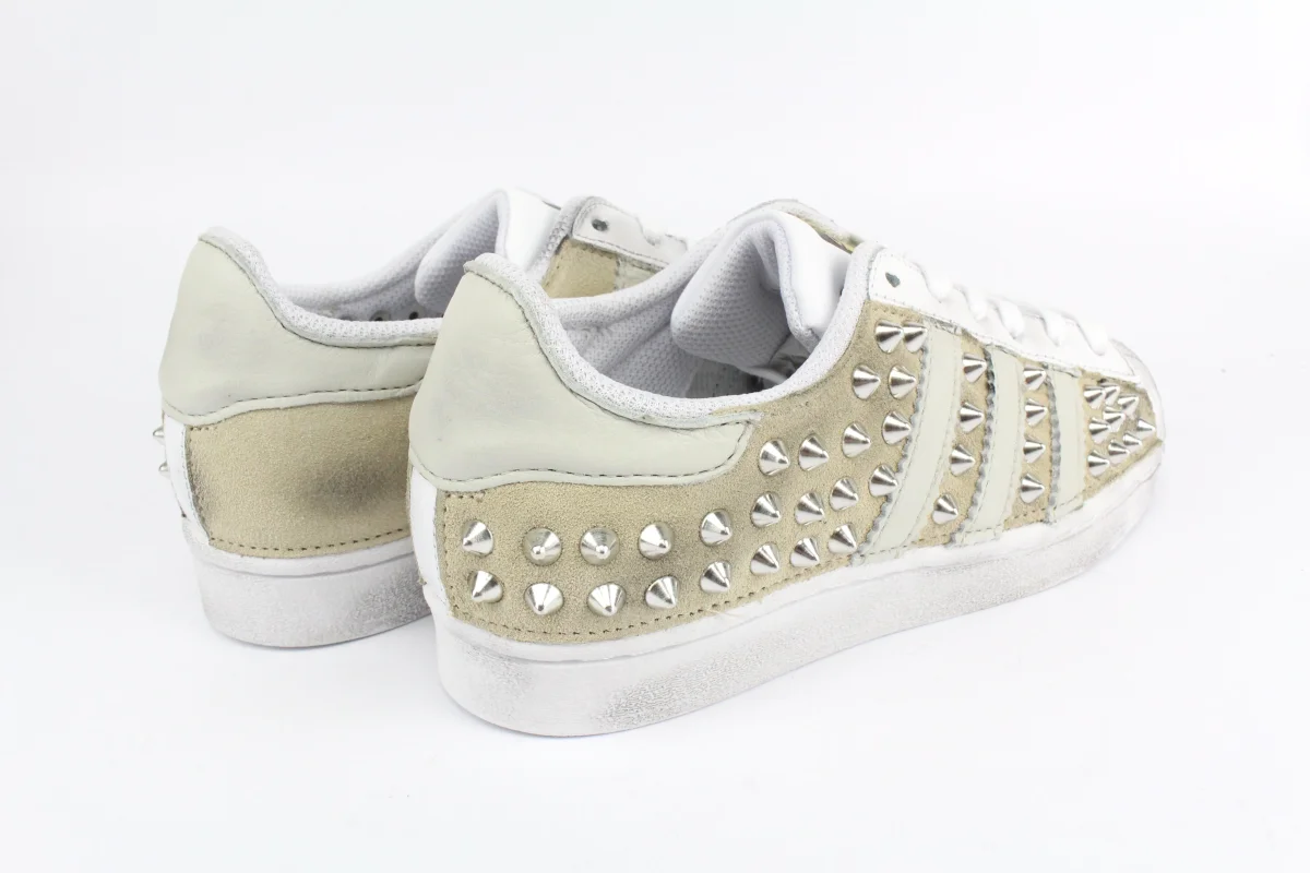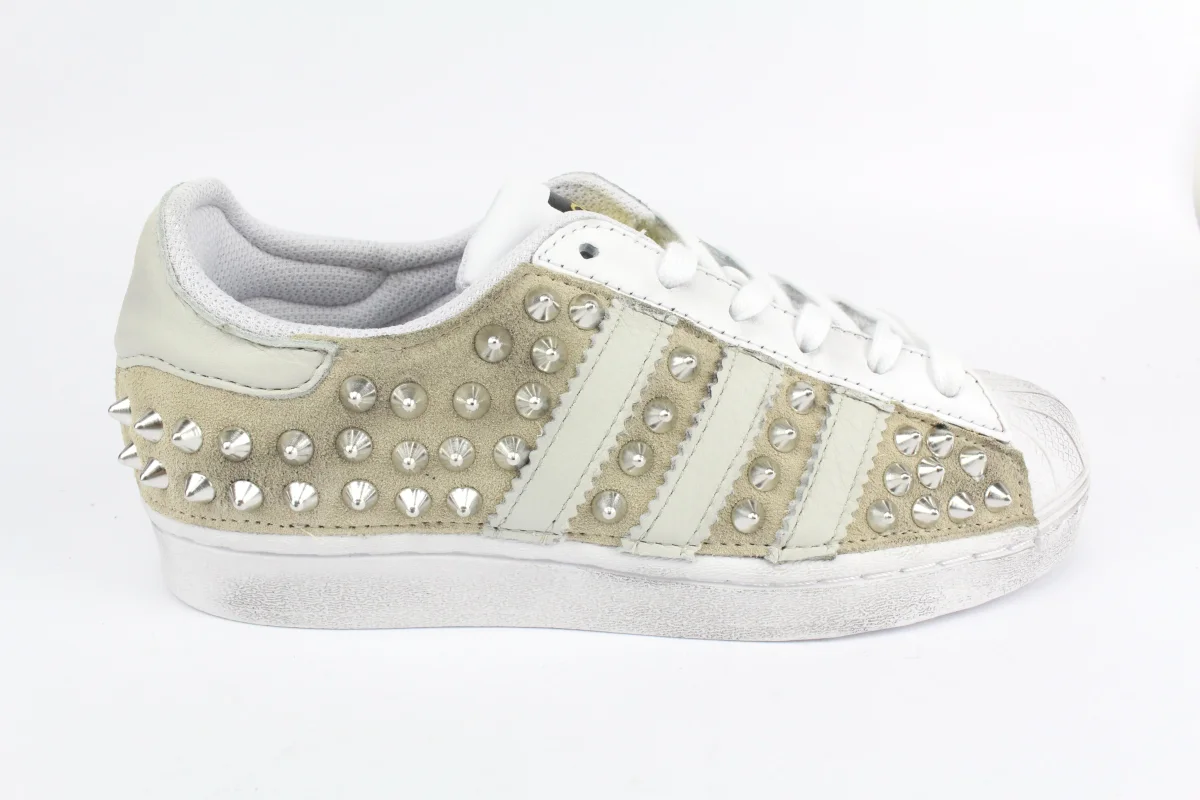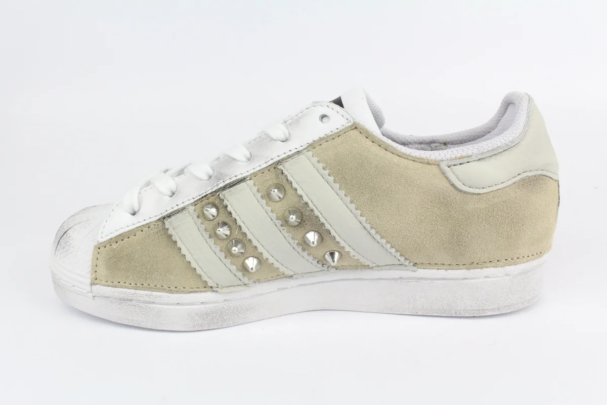 Sneakers Original Adidas Superstar personalizzate a mano, con applicazione di total camoscio Color Beige, arricchite da pelle su tallone e strisce Color Panna. Impreziosite da borchie a cono Nikel.