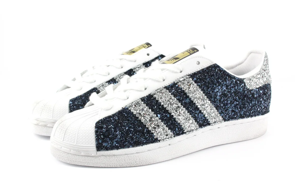 Scarpe originali Adidas Superstar personalizzate a mano con applicazione di glitter blu navy e argento sulle pareti esterne e sul tallone della sneaker. Effetto sporcato. Ogni eventuale imperfezione è frutto del lavoro svolto artigianalmente.