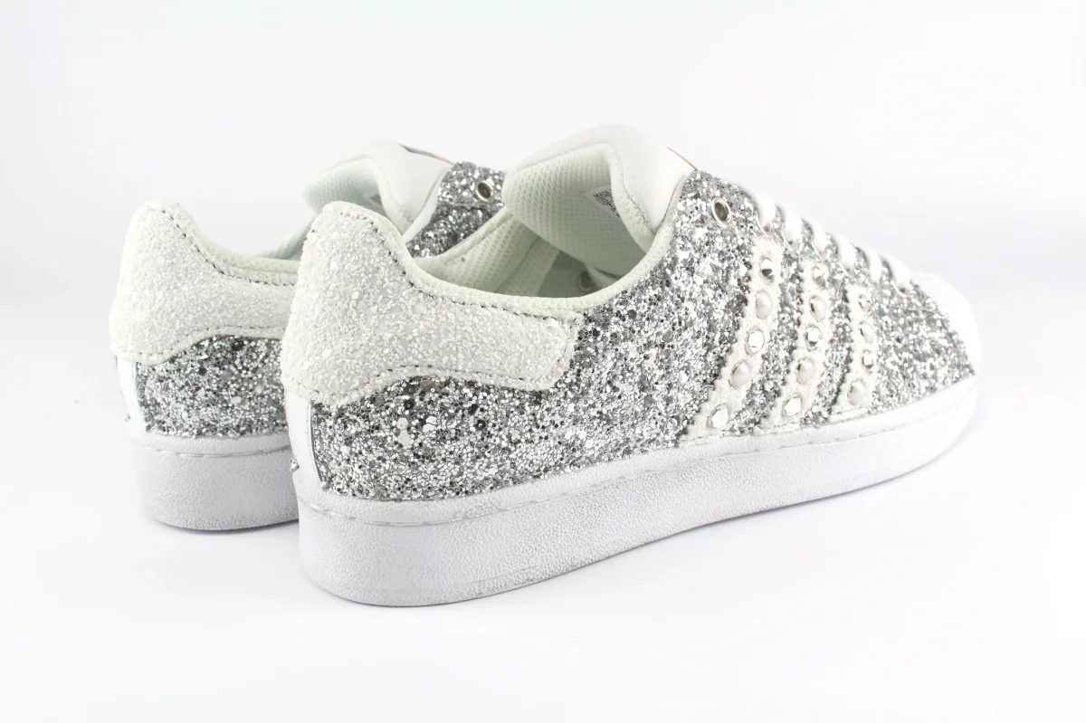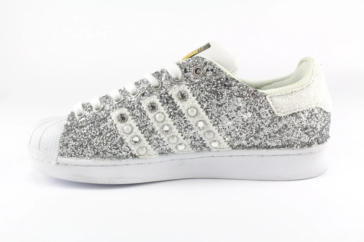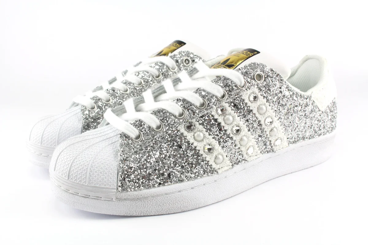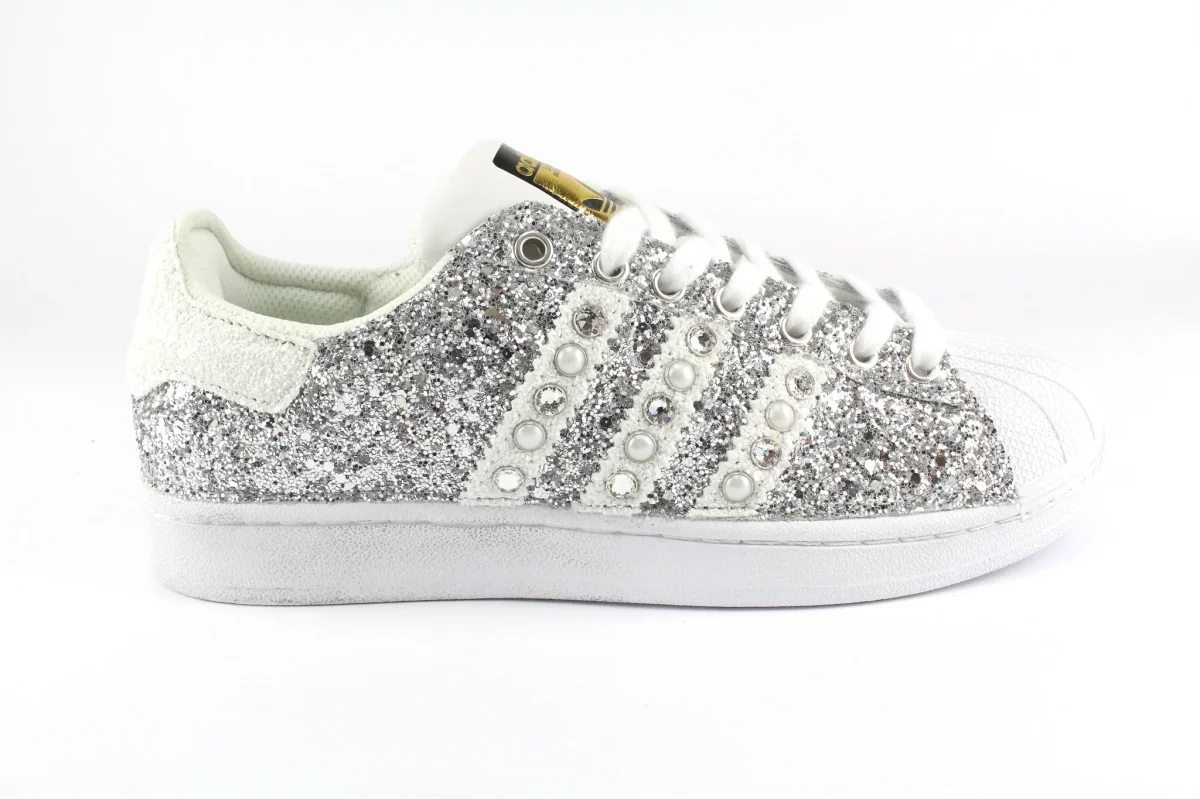 Scarpe originali Adidas Superstar personalizzate a mano con applicazione di glitter argento e bianco e di strass e perle sulle pareti esterne e sul tallone della sneaker. Effetto sporcato