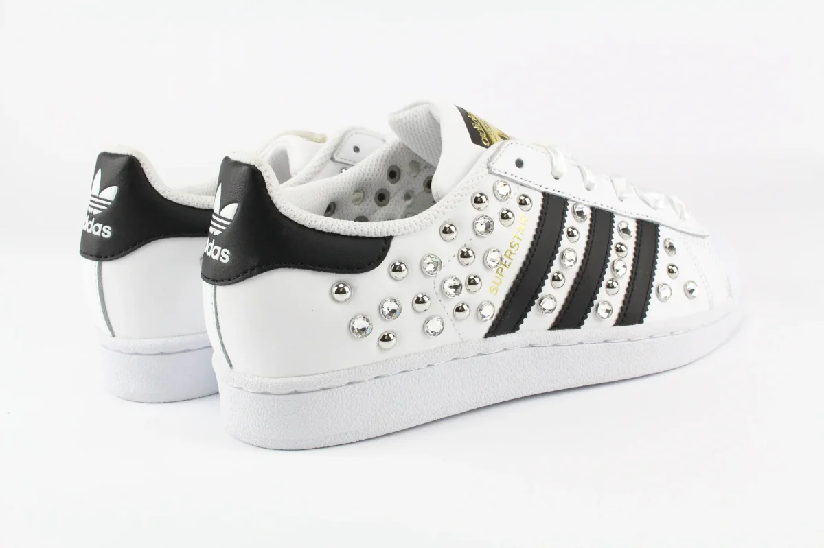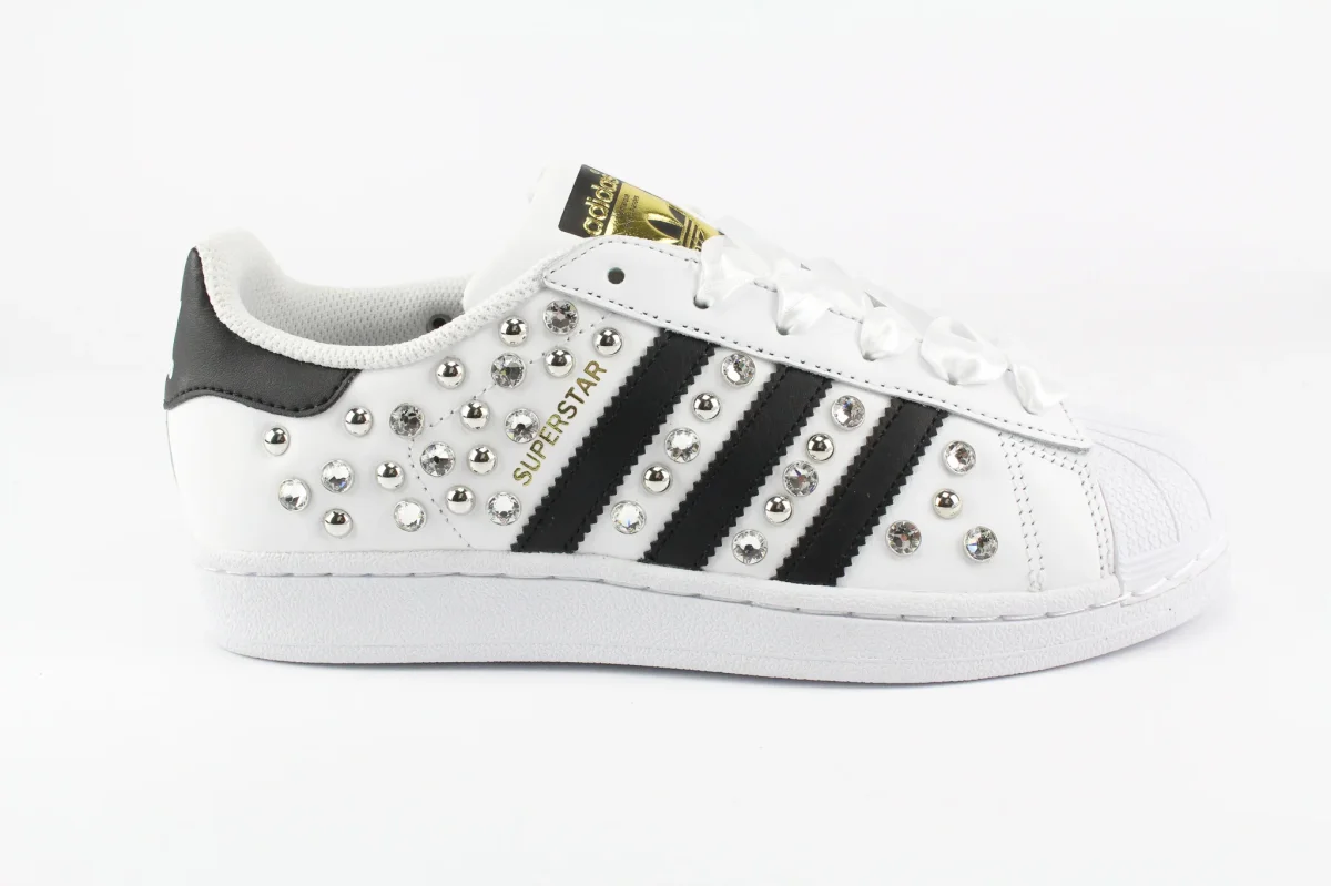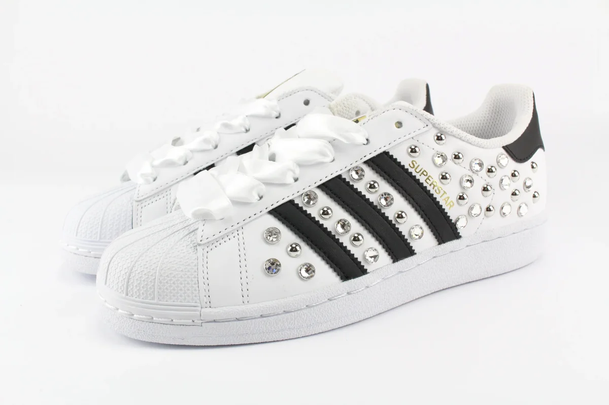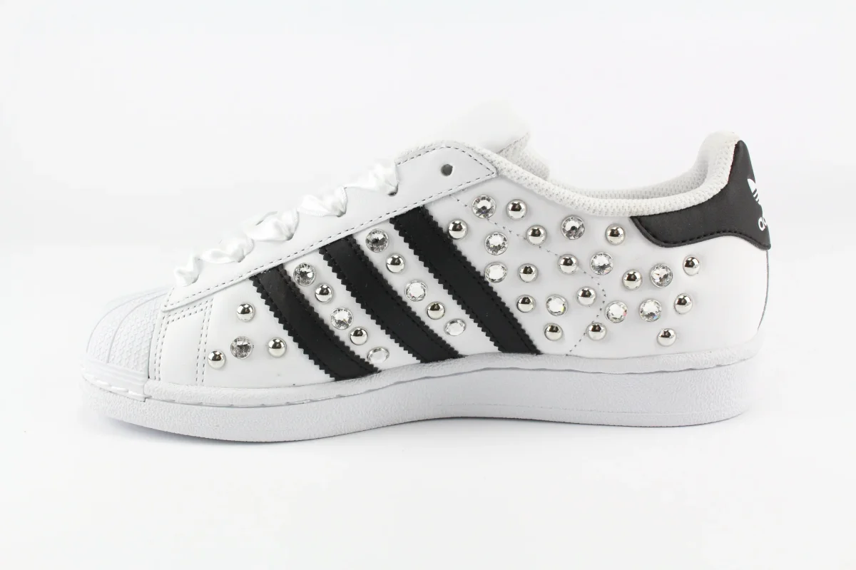 Scarpe originali Adidas Superstar personalizzate a mano con applicazione di un mix di preziosi strass swarovski e borchie di vario tipo su entrambi i lati della scarpa. Lacci di raso bianco.