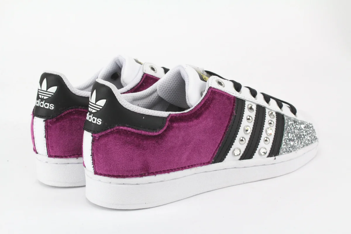 Scarpe originali Adidas Superstar personalizzate a mano con applicazione velluto fuxia e glitter argento, le bande sono impreziosite da un mix di preziosi strass Swarovski e borchie argento su entrambi i lati della scarpa .