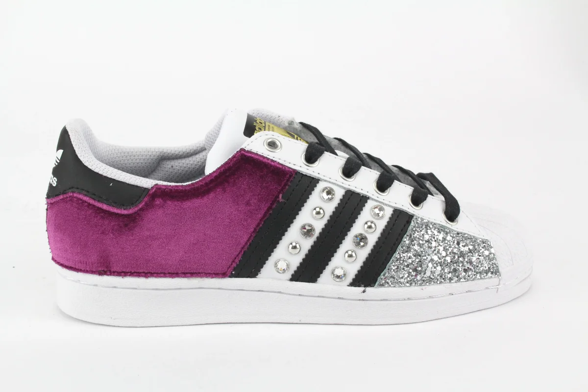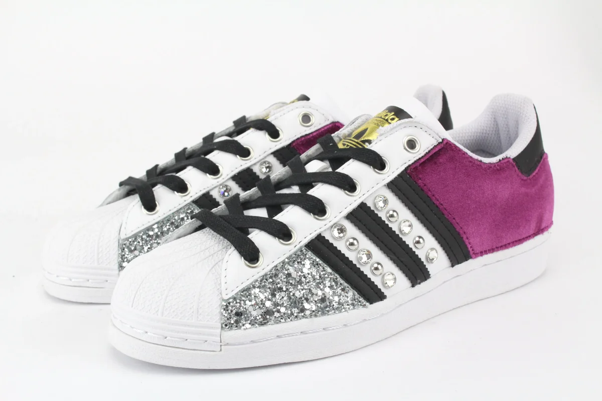 Scarpe originali Adidas Superstar personalizzate a mano con applicazione velluto fuxia e glitter argento, le bande sono impreziosite da un mix di preziosi strass Swarovski e borchie argento su entrambi i lati della scarpa . Lacci neri. Lacci bianchi originali inclusi. Ogni imperfezione è frutto del lavoro svolto artigianalmente.
