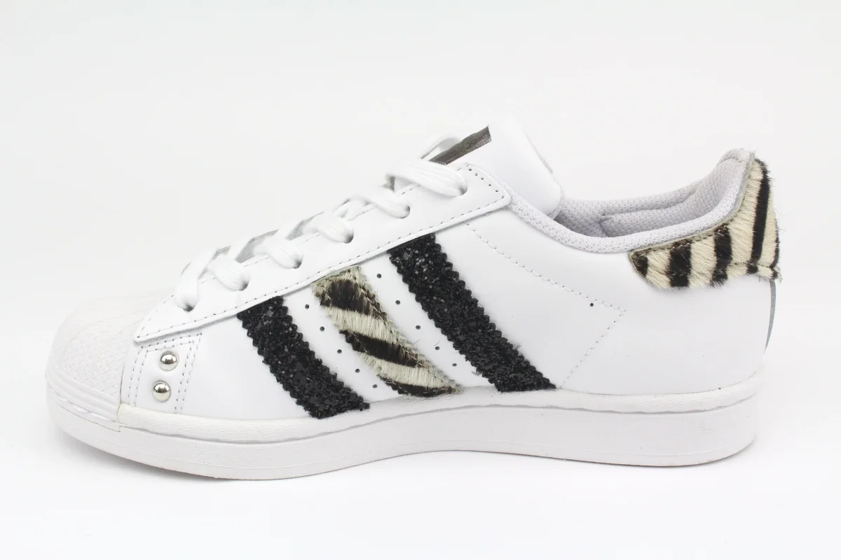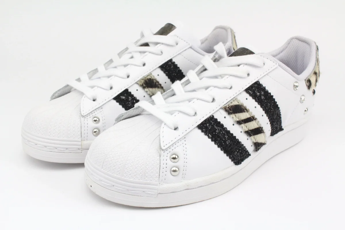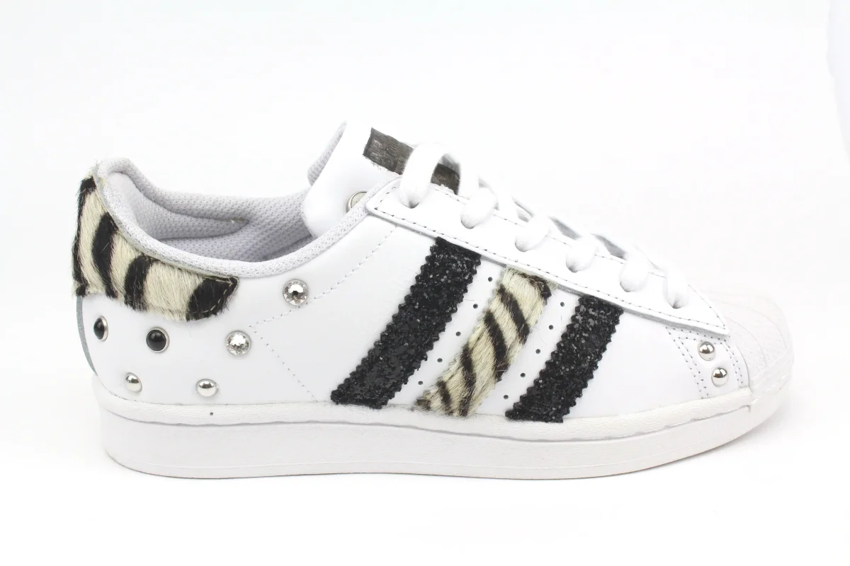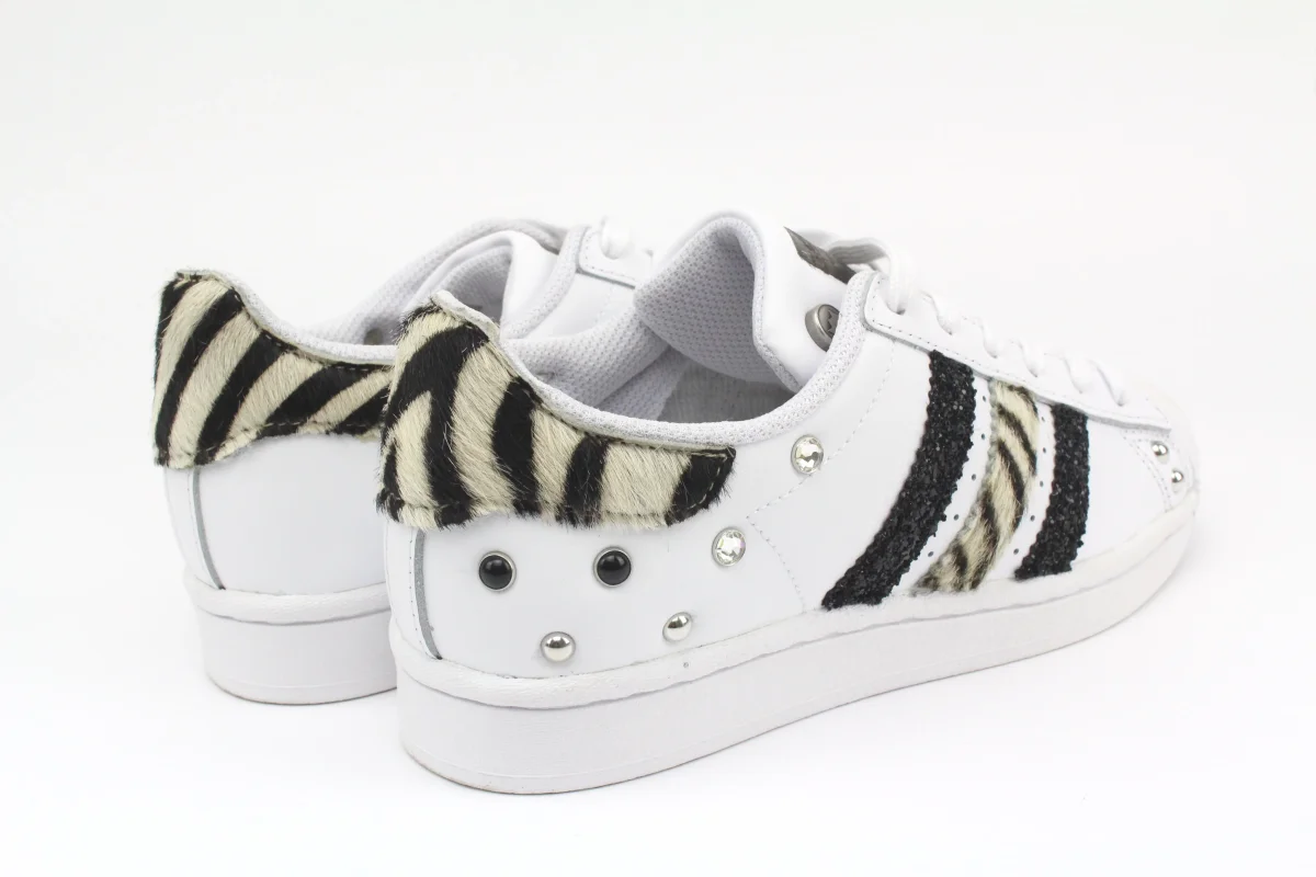 Sneakers originali Adidas Superstar personalizzate a mano con applicazioni di cavallino zebrato e glitter nero sulle bande laterali della scarpa, borchie e strass e cavallino zebrato sul tallone.